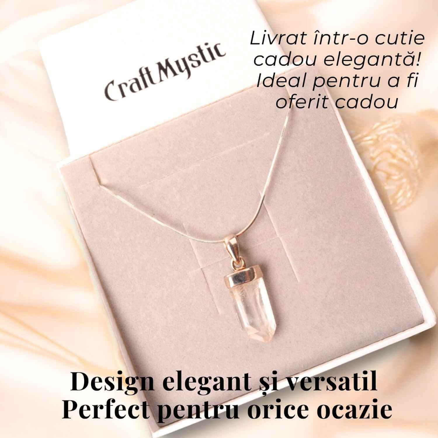 • Materiale: Piatra naturală neregulată cu vârf de cuarț Lemurian, argint 925 pentru lanț și înveliș