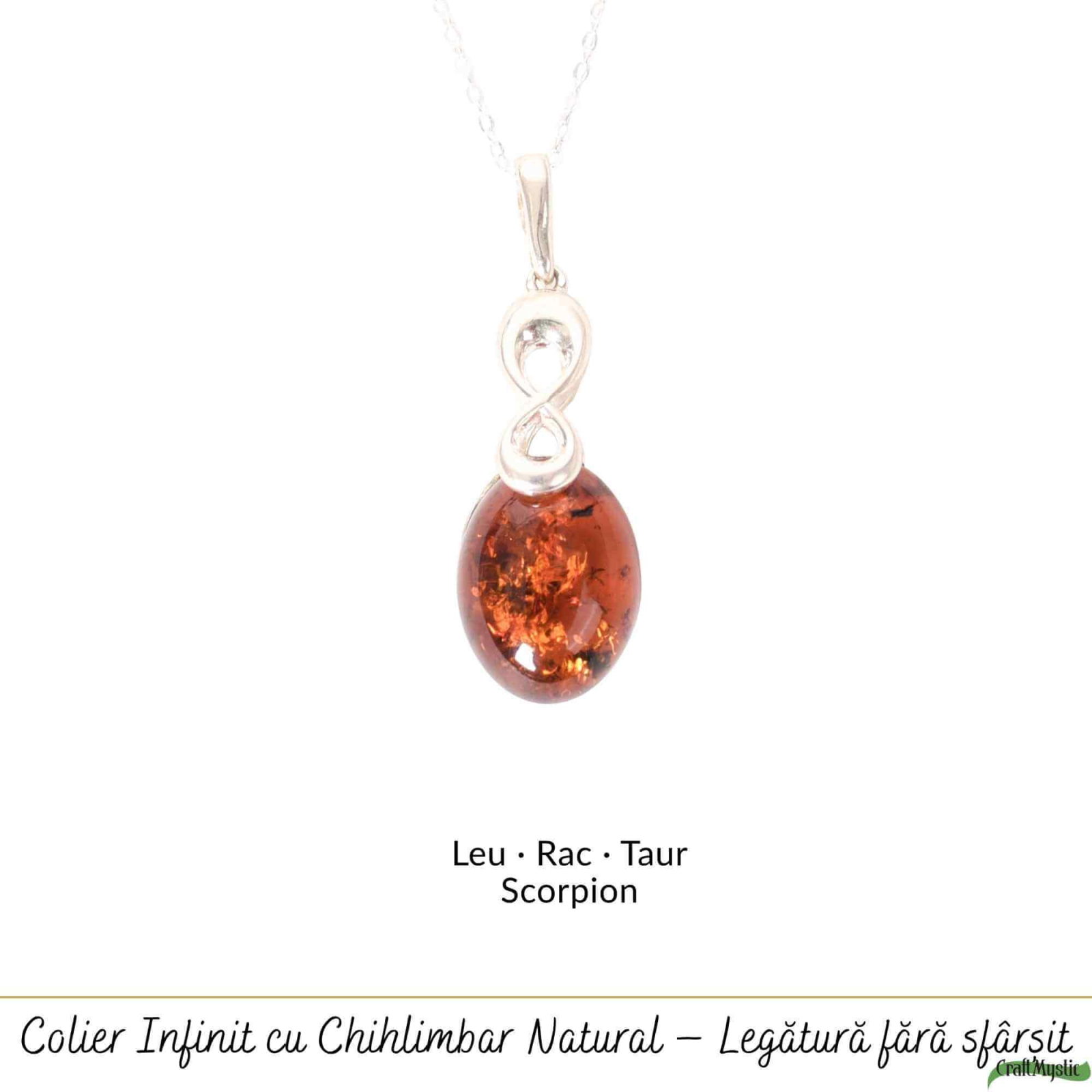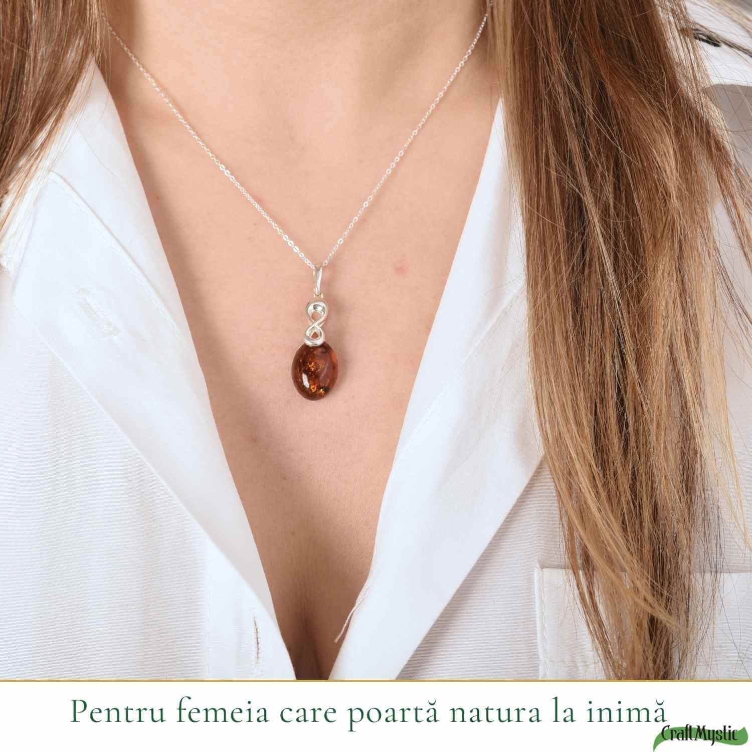 În acest pandantiv oval cu chihlimbar natural, lumina soarelui întâlnește simbolul legăturilor fără sfârșit.