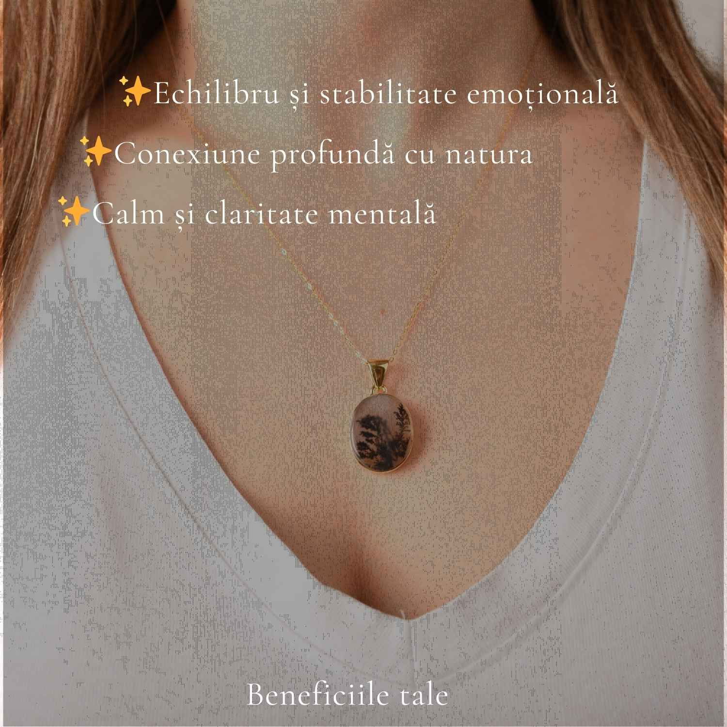Uneori natura creează cele mai frumoase tablouri, iar agatul scenic dendritic este unul dintre ele. Modelele sale par mici peisaje cu ramuri și copaci, surprinse în piatră. Este colierul care aduce liniște, echilibru și o eleganță naturală care nu trece neobservată.