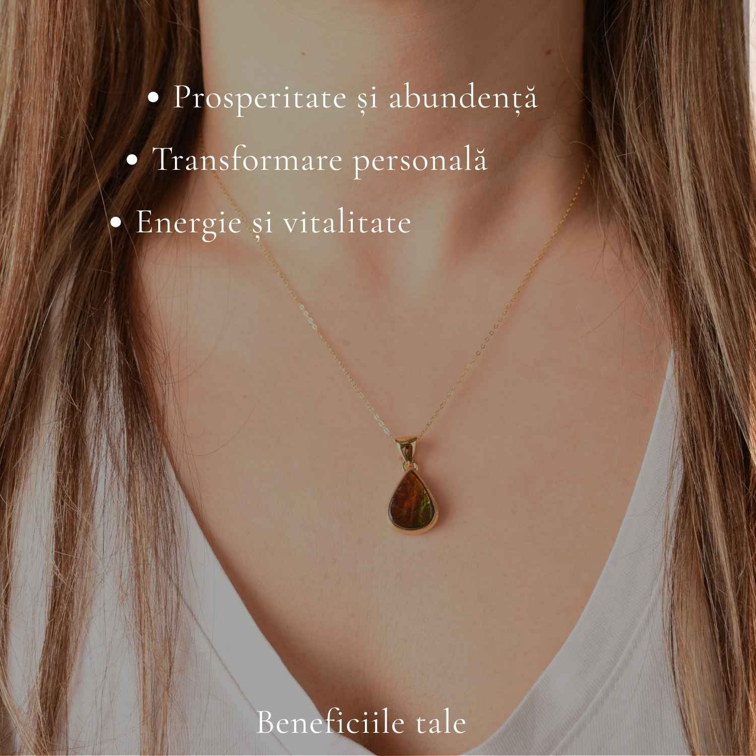 Îți pui colierul dimineața și observi imediat reflexiile fascinante ale amolitului în lumină. Culorile sale schimbătoare atrag discret privirea, iar montura placată cu aur îi oferă eleganță. Este ușor și plăcut de purtat, îl vei uita că îl porți.