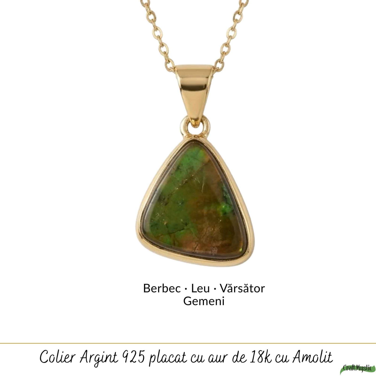 Îți pui colierul dimineața și observi imediat reflexiile fascinante ale amolitului în lumină. Forma triunghiulară îi oferă un aer modern și simbolic, iar lanțul placat cu aur îi adaugă eleganță. Este confortabil și echilibrat pe gât, devenind rapid piesa centrală a ținutei tale.