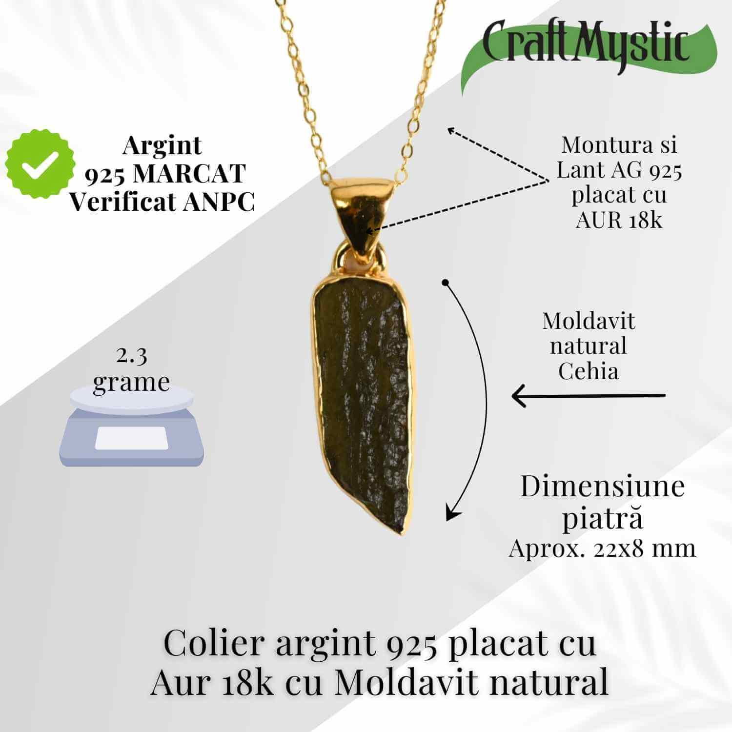 Descoperă energia unică a Moldavitului – o piatră cosmică rară, formată în urma impactului unui meteorit, care aduce o vibrație puternică de transformare, protecție și evoluție spirituală. Acest colier din argint 925 placat cu aur 18k evidențiază frumusețea brută și autentică a cristalului, purtând în el misterul și forța Universului.