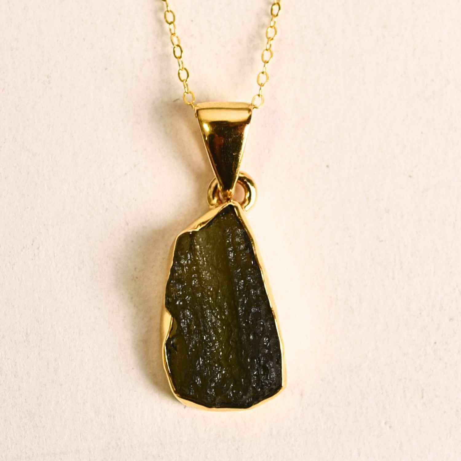 Moldavitul – piatra rara cu energie cosmica – este apreciat pentru puterea sa de transformare, protectie si elevare spirituala. Placarea cu aur 18k pune in valoare verdele profund al pietrei brute si creeaza o piesa cu semnificatie, gata de purtat zi de zi.
