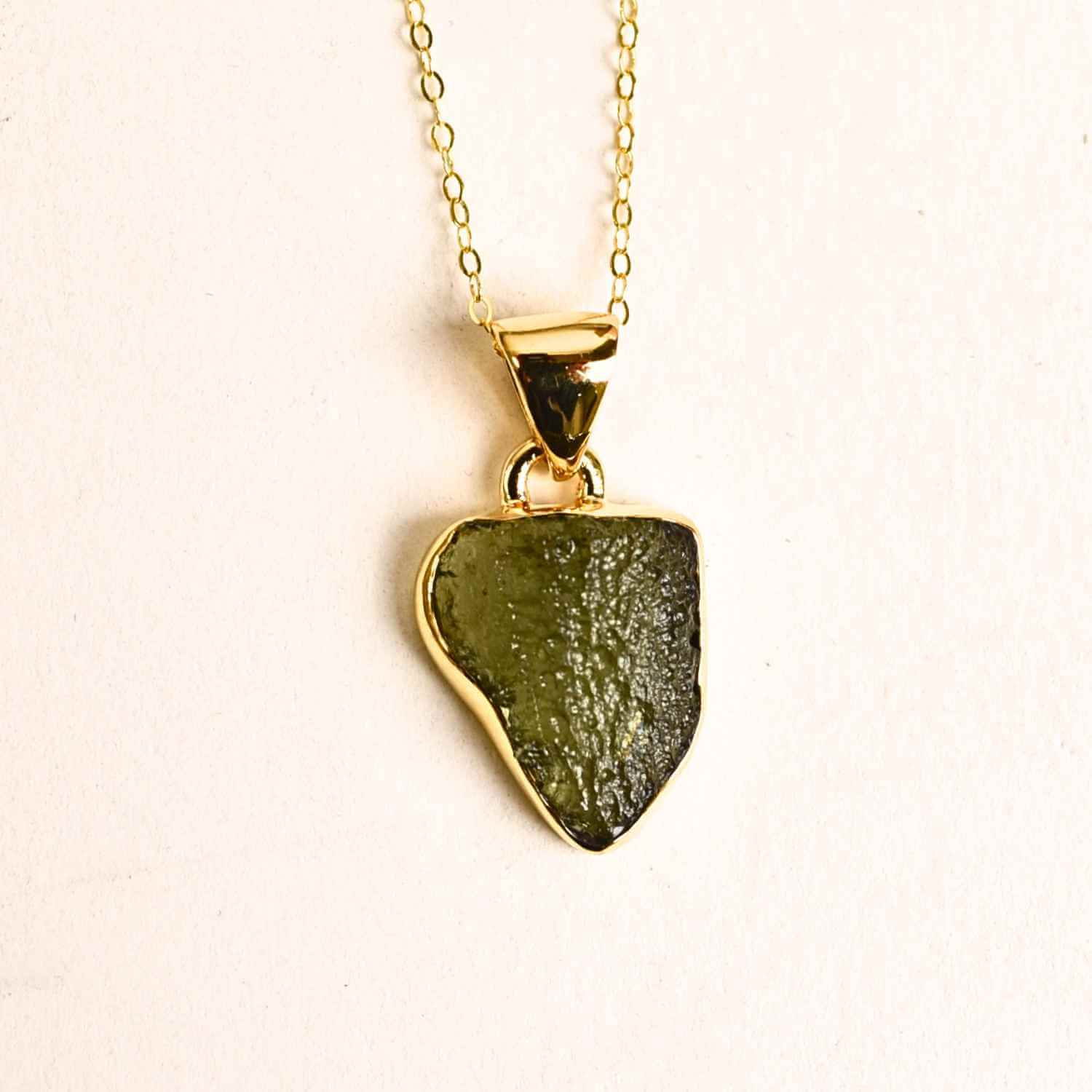 Moldavitul, piatra rara cu energie cosmica, invita la schimbare, claritate si protectie. Contrastul cald al placarii cu aur 18k evidentiaza verdele autentic al pietrei, iar forma sa naturala creeaza o bijuterie cu mesaj profund.