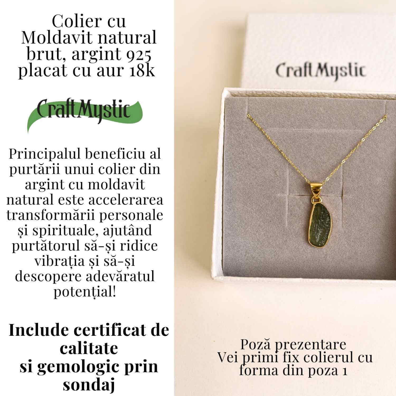 Moldavitul, piatra rara cu energie cosmica, sustine schimbarea, claritatea si protectia. Finisajul cald de aur 18k evidentiaza verdele autentic al pietrei brute si transforma colierul intr-o bijuterie cu mesaj profund.