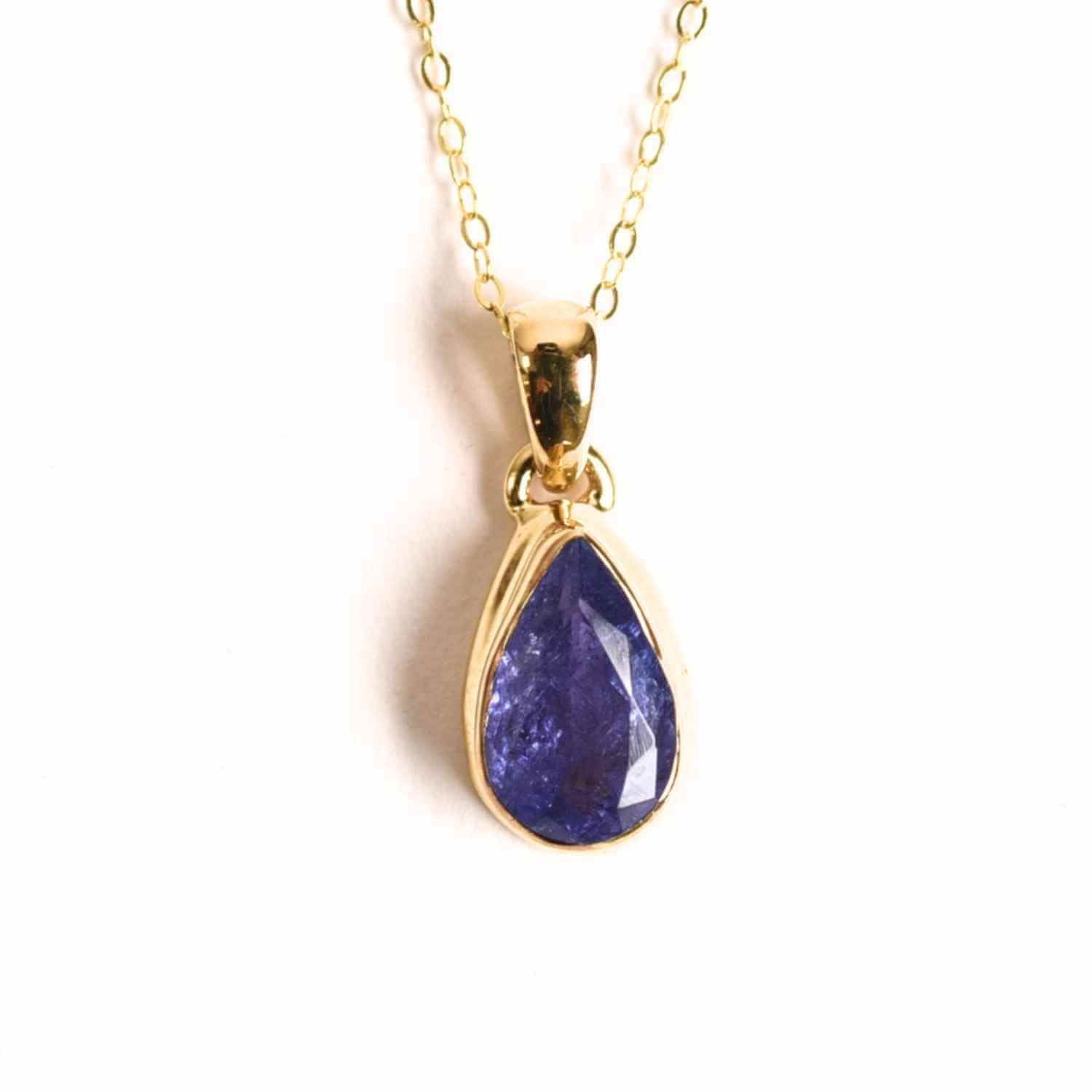 Colierul din argint 925 placat cu aur de 18K, cu piatra naturala de Tanzanit fatetat in forma de lacrima, este o oda a luminii si a purificarii sufletului.