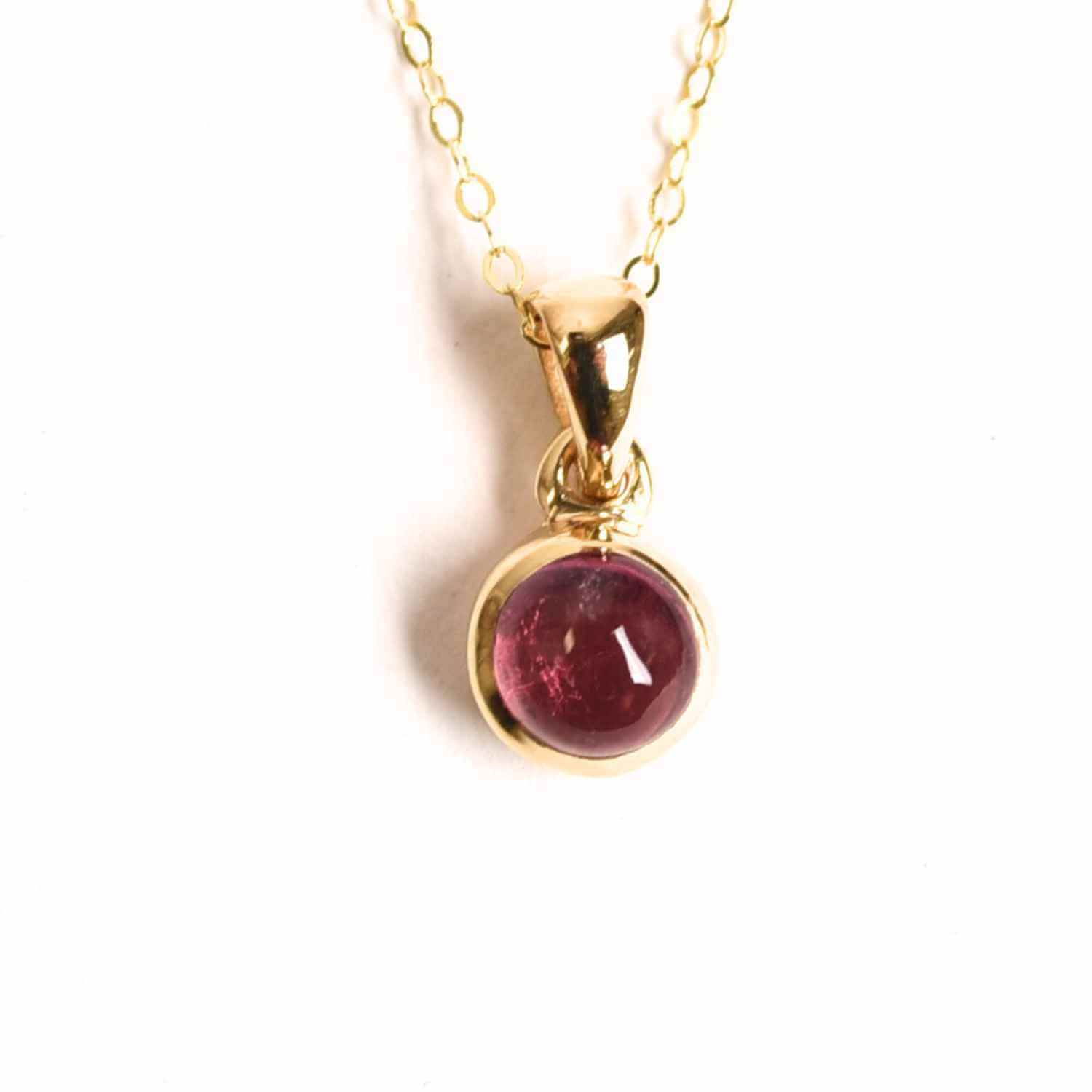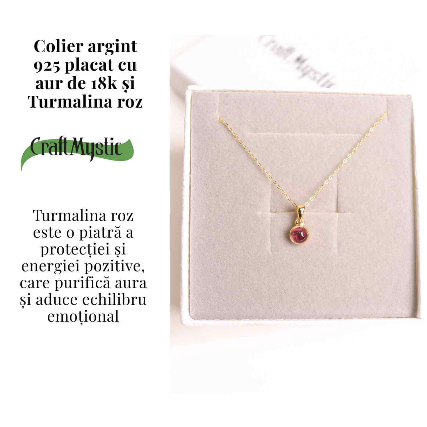 Colierul din argint 925 placat cu aur de 18K, impodobit cu o piatra de turmalina roz naturala in forma rotunda, este un talisman al iubirii pure si al echilibrului emotional.