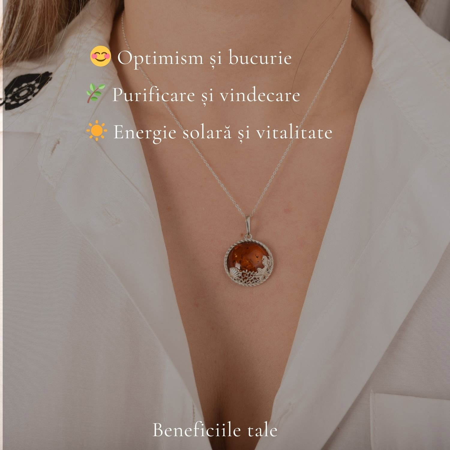 Acest pandantiv rotund, cu căluț de mare, stea de mare și scoică, aduce la gâtul tău vibrația apei și lumina caldă a chihlimbarului.