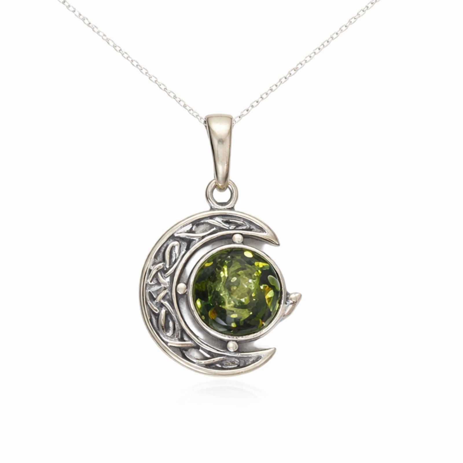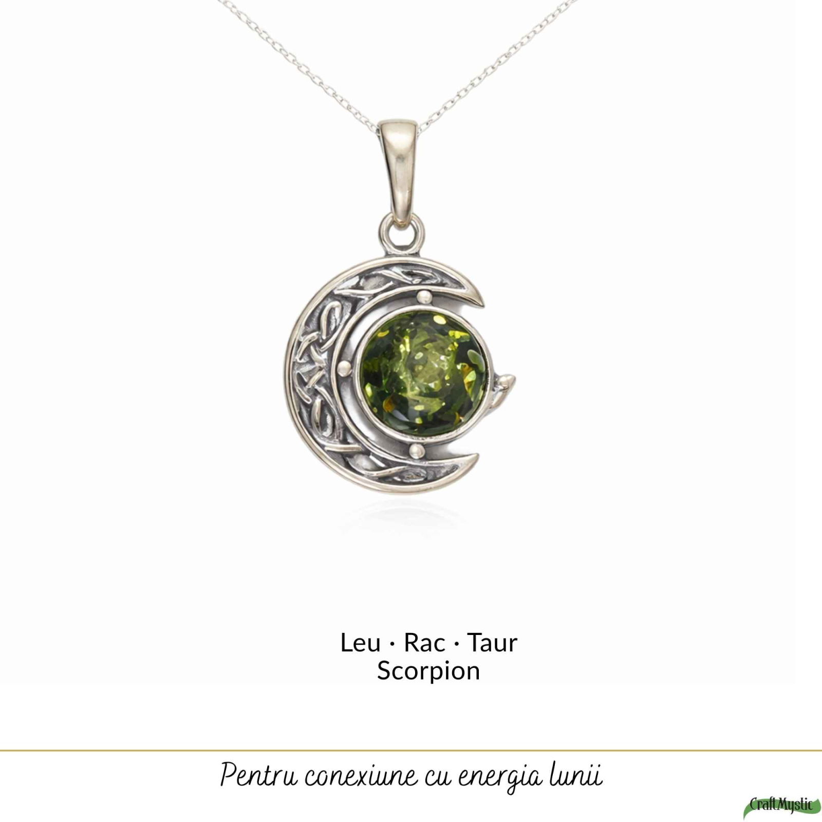 Semiluna simbolizează intuiția, schimbarea și energia feminină, iar bobița de chihlimbar verde devine un nucleu de lumină și protecție purtat aproape de tine.