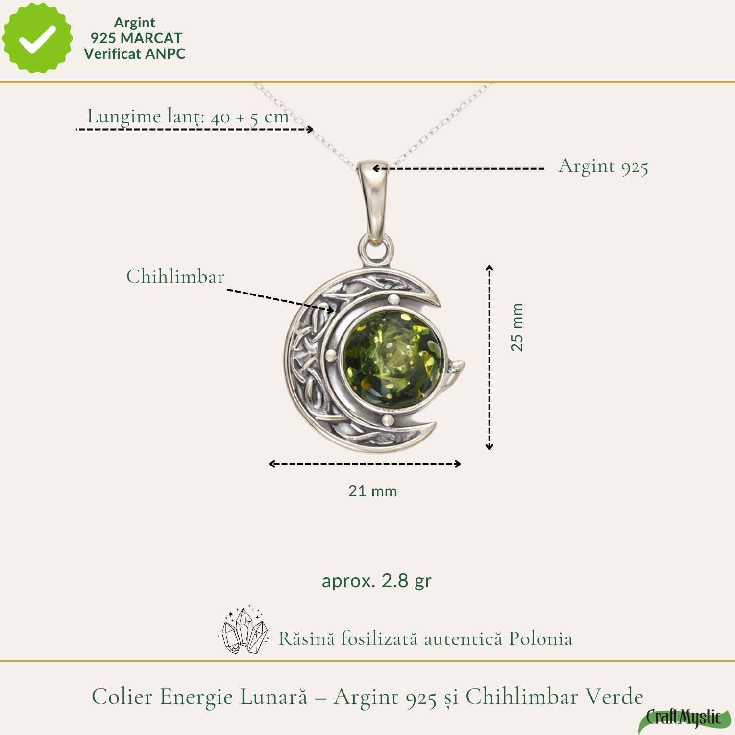 Colier unisex din argint 925 cu semilună și bobiță de chihlimbar verde natural, simbol al intuiției și al echilibrului interior. Ușor și delicat (2.78 g), îl vei uita că îl porți, dar îți va aduce zilnic o stare de protecție, vitalitate și lumină caldă. Vine în cutie cadou CraftMystic, pregătit să fie oferit cu sens. 🌙✨