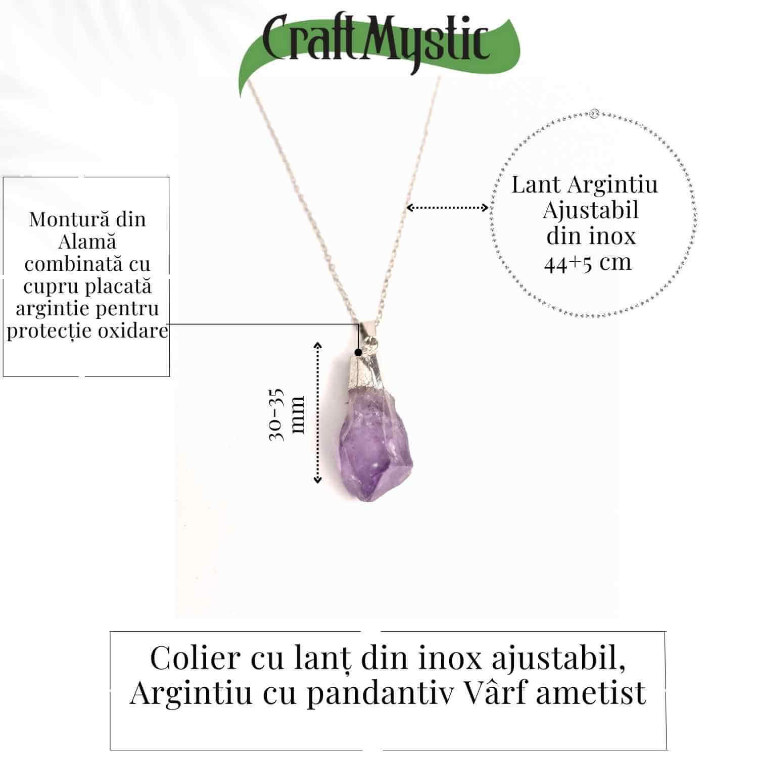 Acest colier elegant cu pandantiv din ametist brut în formă de vârf este lucrat manual și perfect pentru cei care caută un accesoriu simbolic și rafinat. Pandantivul, de dimensiuni între 30-35 mm, este fixat pe un lanț ajustabil de 44+5 cm și realizat dintr-o montură de alamă combinată cu cupru, placată argintiu pentru o protecție optimă împotriva oxidării.