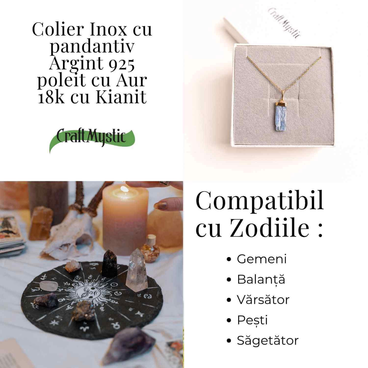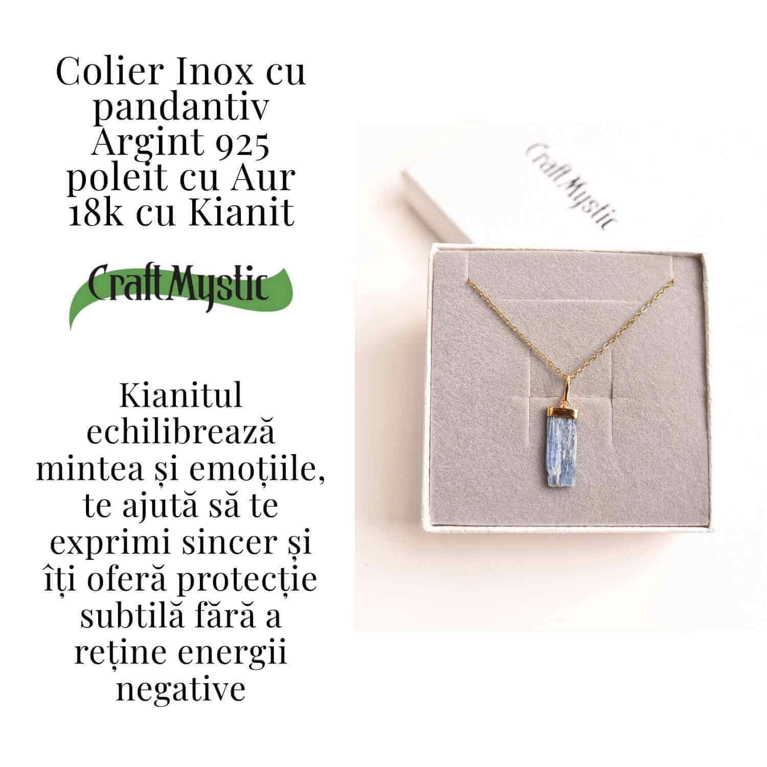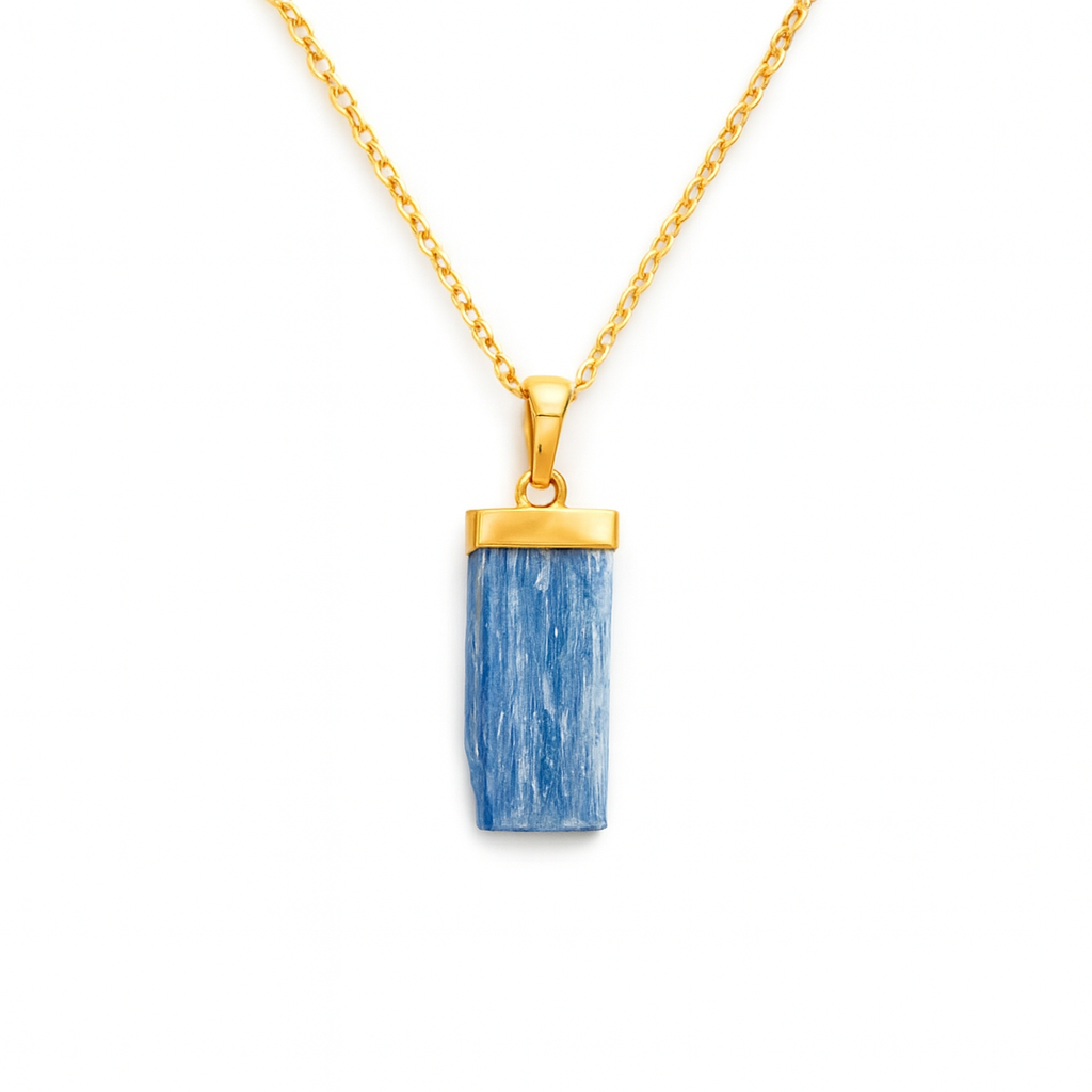 Kianitul brut este o piatră asociată cu echilibrul, sinceritatea și intuiția. În această montură rafinată din argint placat cu aur, devine un talisman puternic pentru cei care vor să își exprime adevărul cu calm și claritate. A purta acest colier înseamnă a alege să rămâi centrat(ă), sincer(ă) și ancorat(ă) în propriul adevăr.