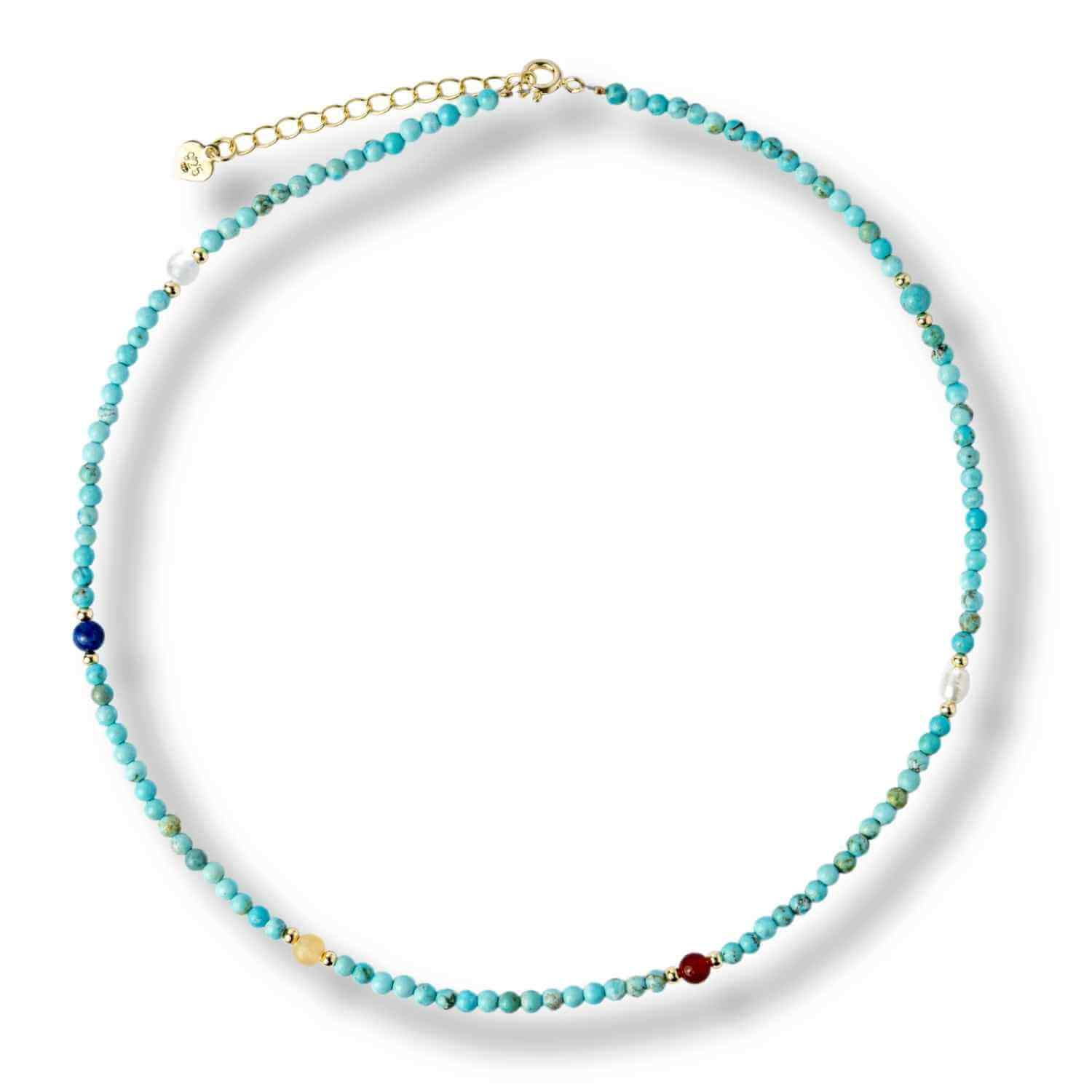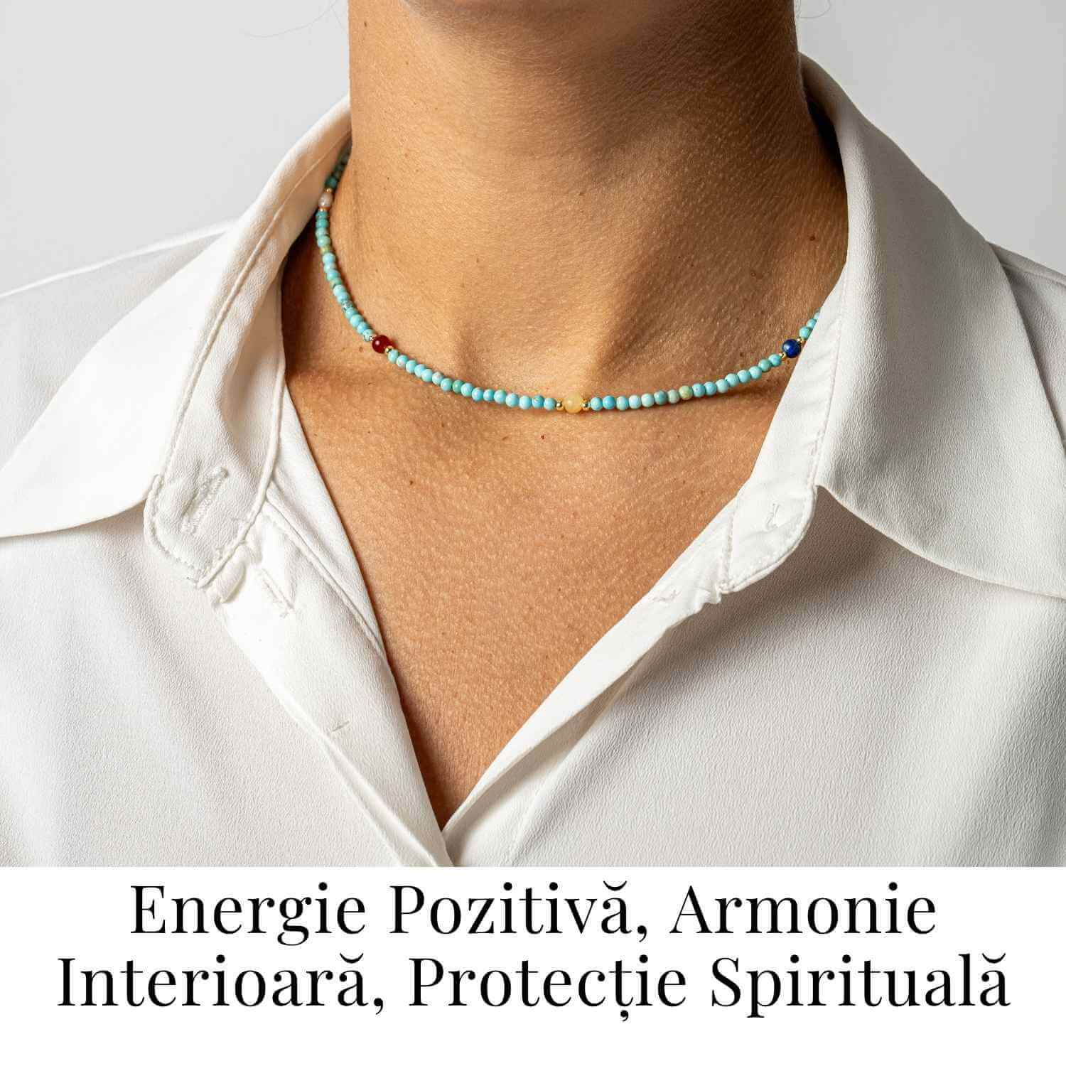 Acest colier choker rafinat, turcoaz natural și perle autentice este o bijuterie a echilibrului și a energiei pozitive.