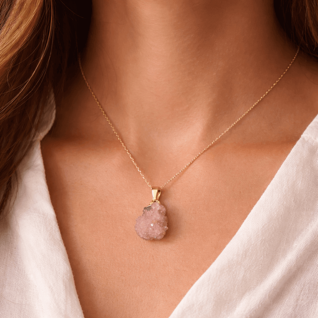 Acest colier cu ametist roz natural este mai mult decat un accesoriu – este o declaratie subtila de feminitate, echilibru si rafinament. Cristalul brut, in forma neregulata, pastreaza textura sa naturala, fiecare piesa fiind unica, exact asa cum este si energia celei care il poarta.