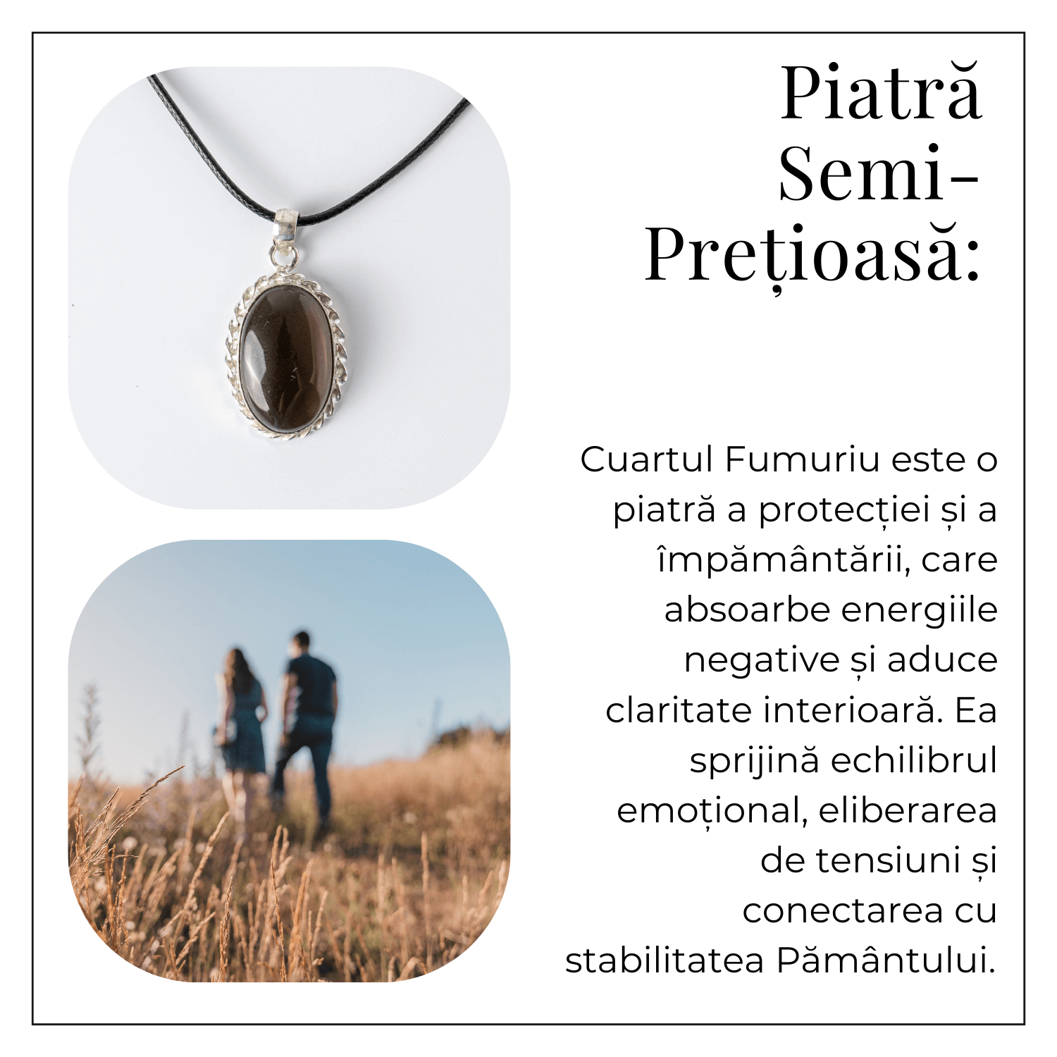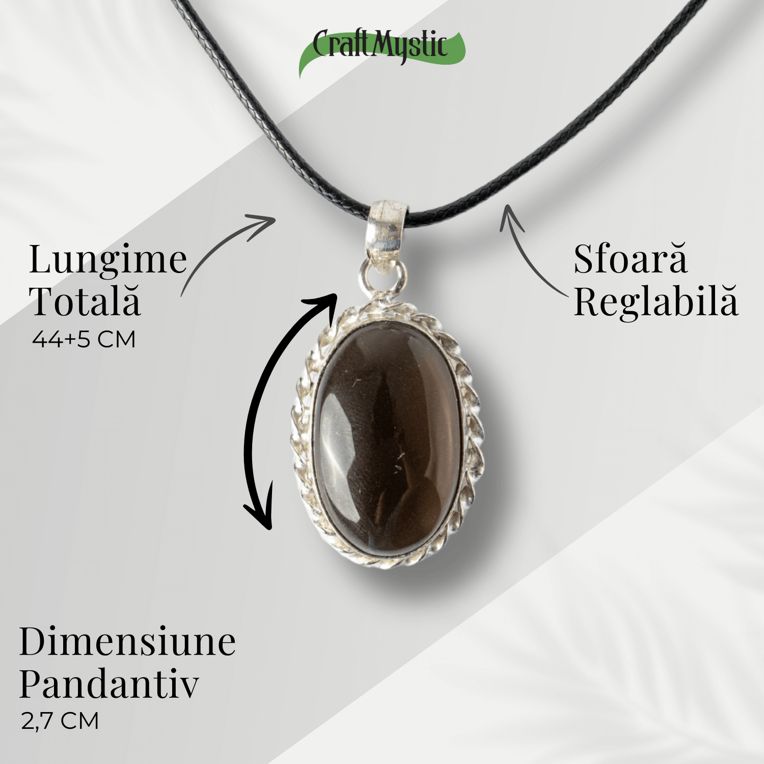 Acest colier cu pandantiv oval din cuart fumuriu este un simbol al stabilitatii, protectiei si echilibrului interior. Forma ovala a pandantivului amplifica energia de armonizare si continuitate, sprijinind purtatoarea sa gaseasca echilibru in fiecare aspect al vietii. Cuartul fumuriu este cunoscut drept „piatra impamantarii”, absorbant al energiilor negative si calauza spre liniste interioara si claritate.