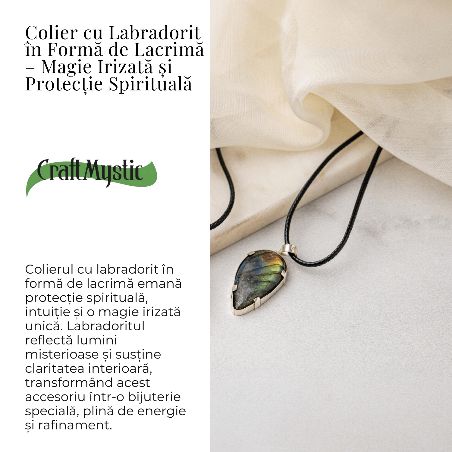 Colierul cu labradorit natural în forma eleganta de picatura aduce un aer de mister si magie protectoare. Forma de picatura simbolizeaza claritatea interioara, fluxul intuitiei si curgerea energiilor superioare. Labradoritul, cu jocurile sale irizate de albastru-auriu, este piatra transformarii si a viziunii profunde, un talisman pentru cei care cauta ghidare spirituala si lumina in momentele de schimbare.