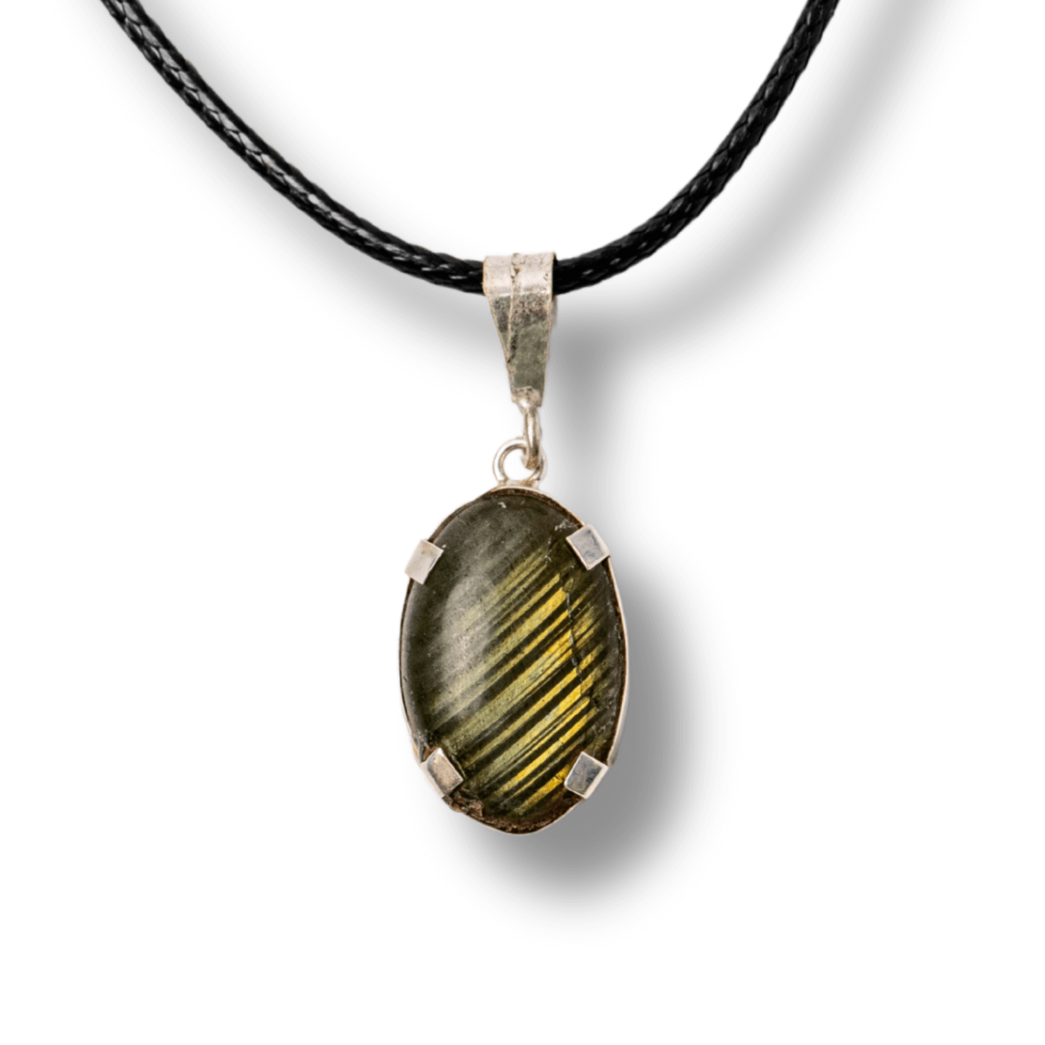 Labradoritul, cunoscut drept „piatra magiei interioare”, dezvăluie reflexe irizate verzi-gălbui care activează intuiția, protejează aura și luminează căile nevăzute ale sufletului. Un pandantiv creat pentru femeia care își dorește să pășească în viață cu claritate, încredere și energie subtilă.