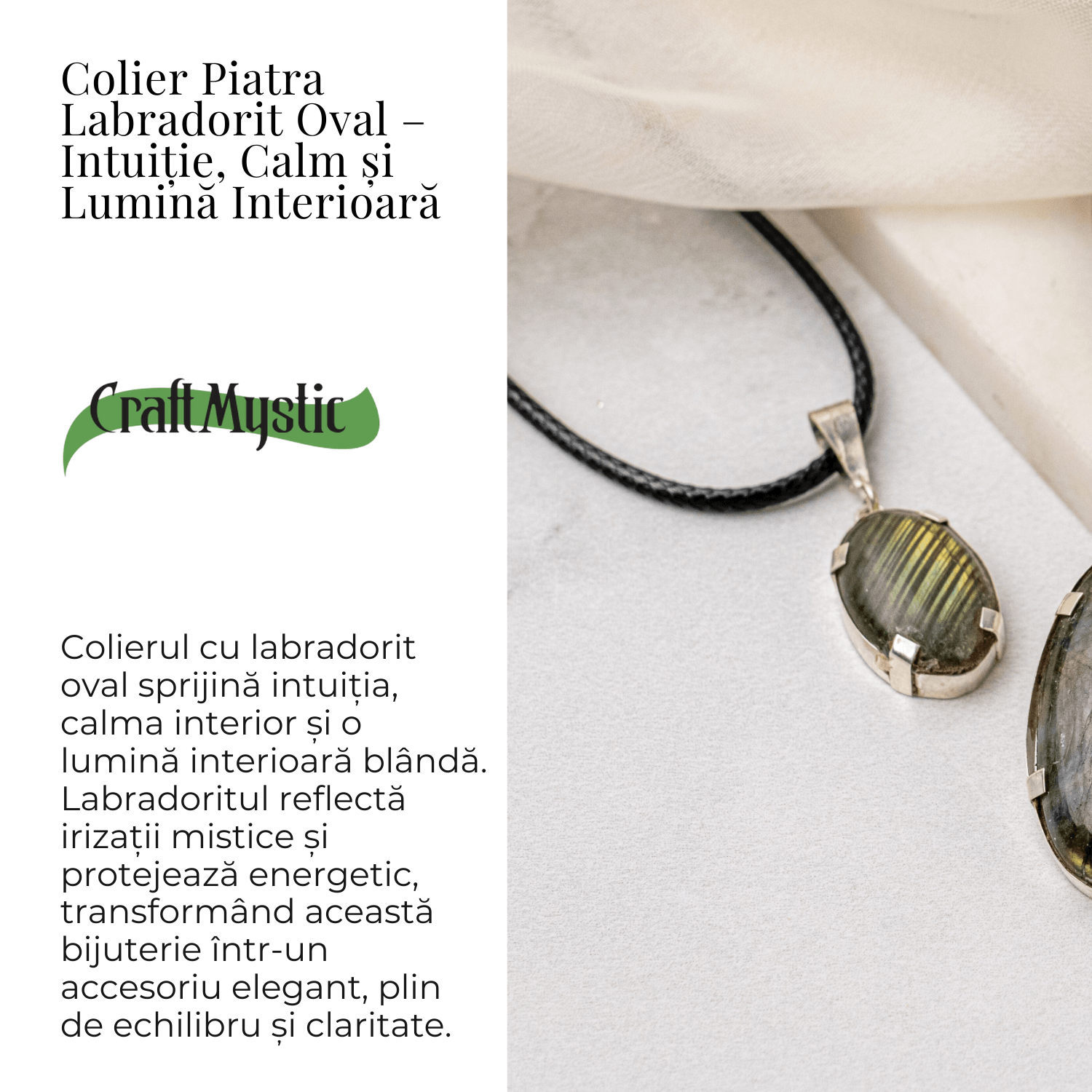 Acest colier cu labradorit natural, în formă ovală, transmite o vibrație misterioasă, profund intuitivă. Forma ovală reprezintă echilibrul, continuitatea și protecția energetică, fiind simbolul armoniei dintre minte, trup și spirit.