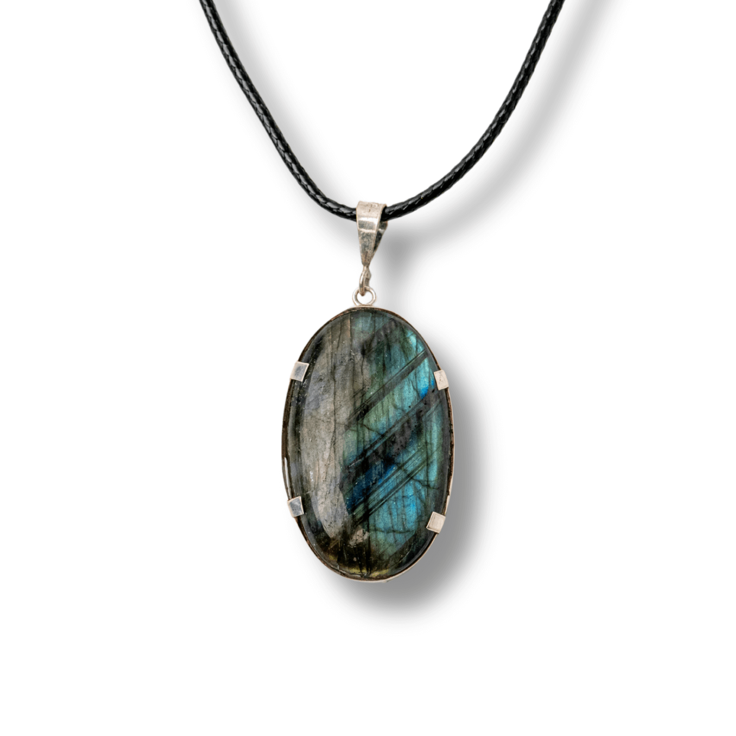 Colierul cu labradorit oval emana o magie irizata unica, in nuante de albastru, verde si gri, asemeni unei ferestre catre lumea intuitiei si a taramurilor subtile.