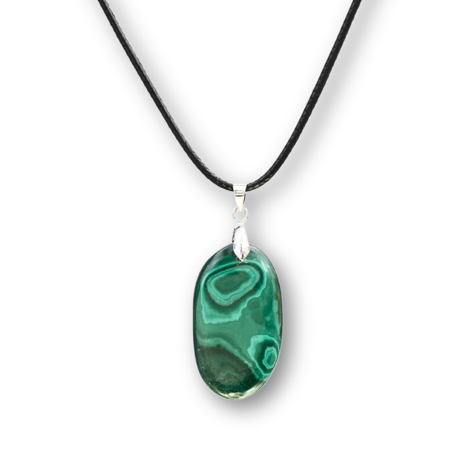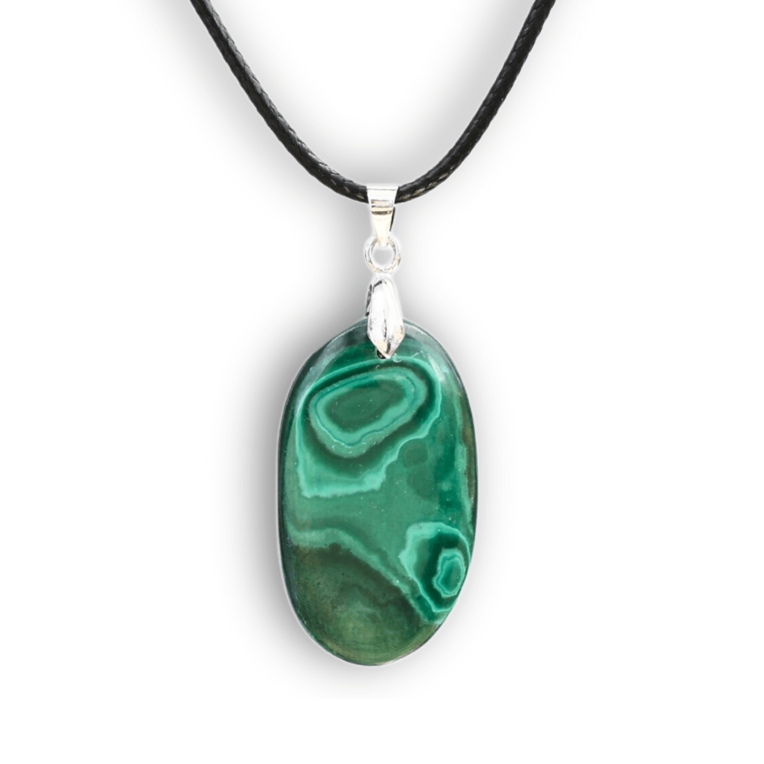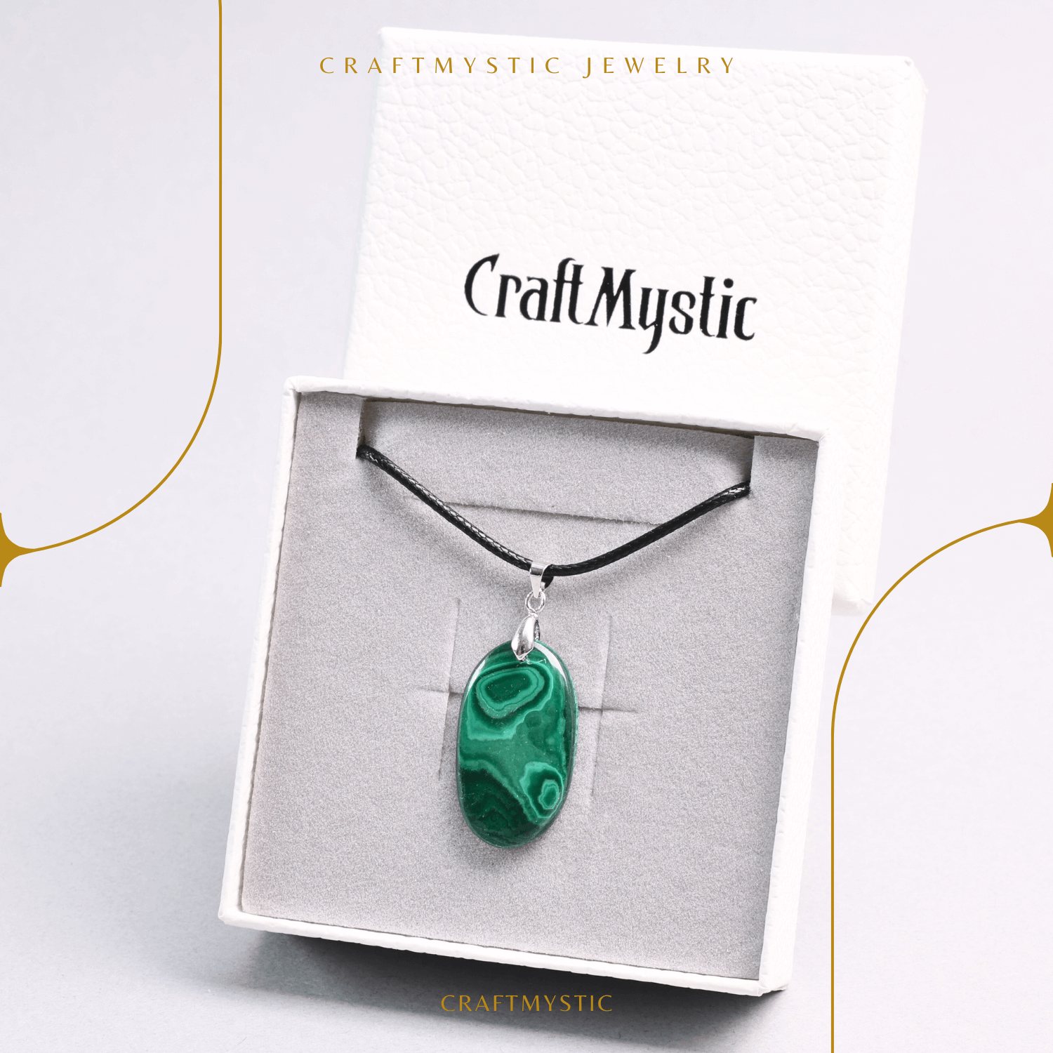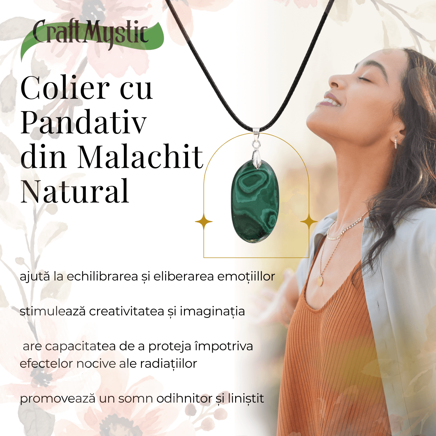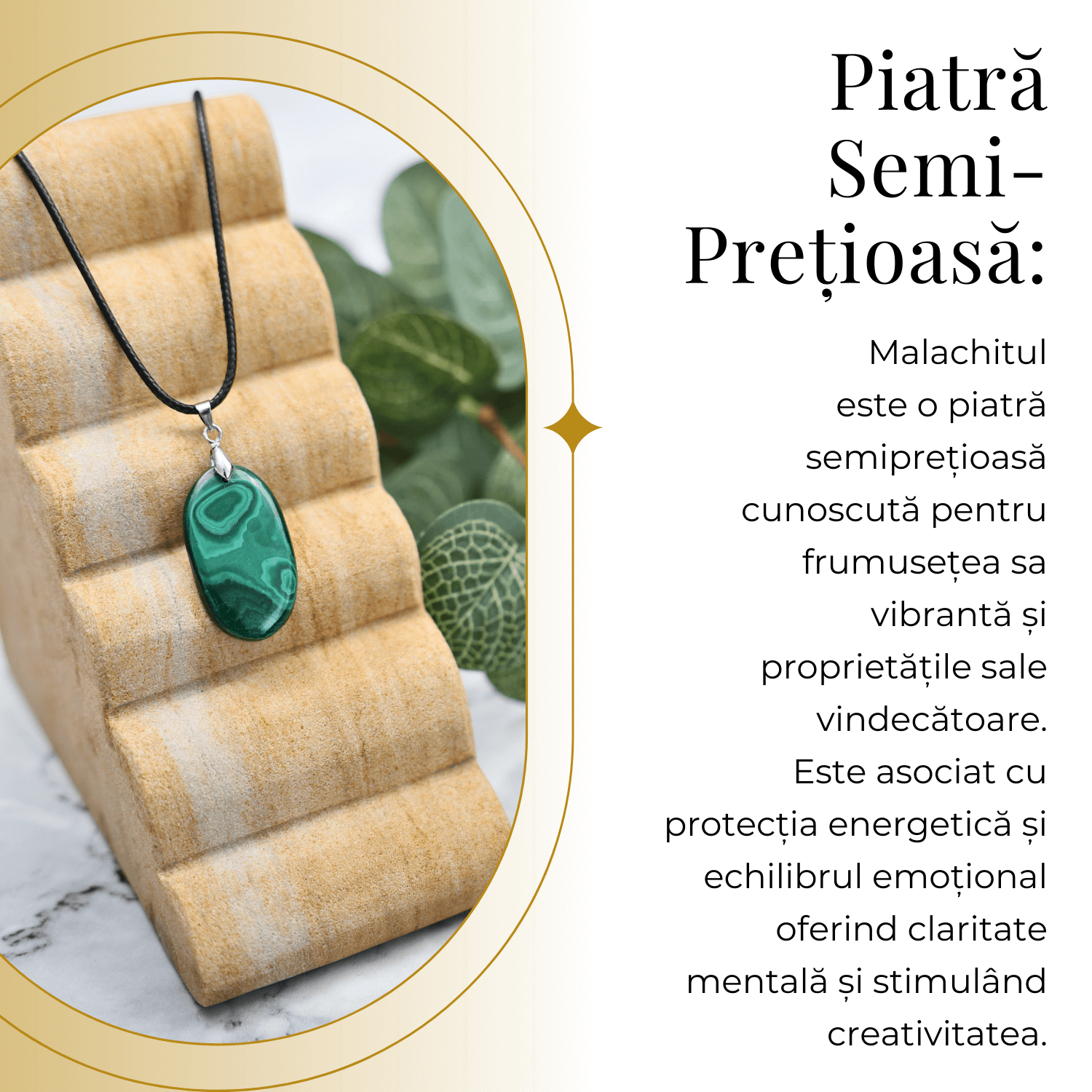 Unicitatea Pandantivului: Fiecare pandantiv este unic, realizat din malachit natural. Nuanțele de verde și modelele variază, iar mici imperfecțiuni pot apărea, subliniind autenticitatea și frumusețea naturală a pietrei.