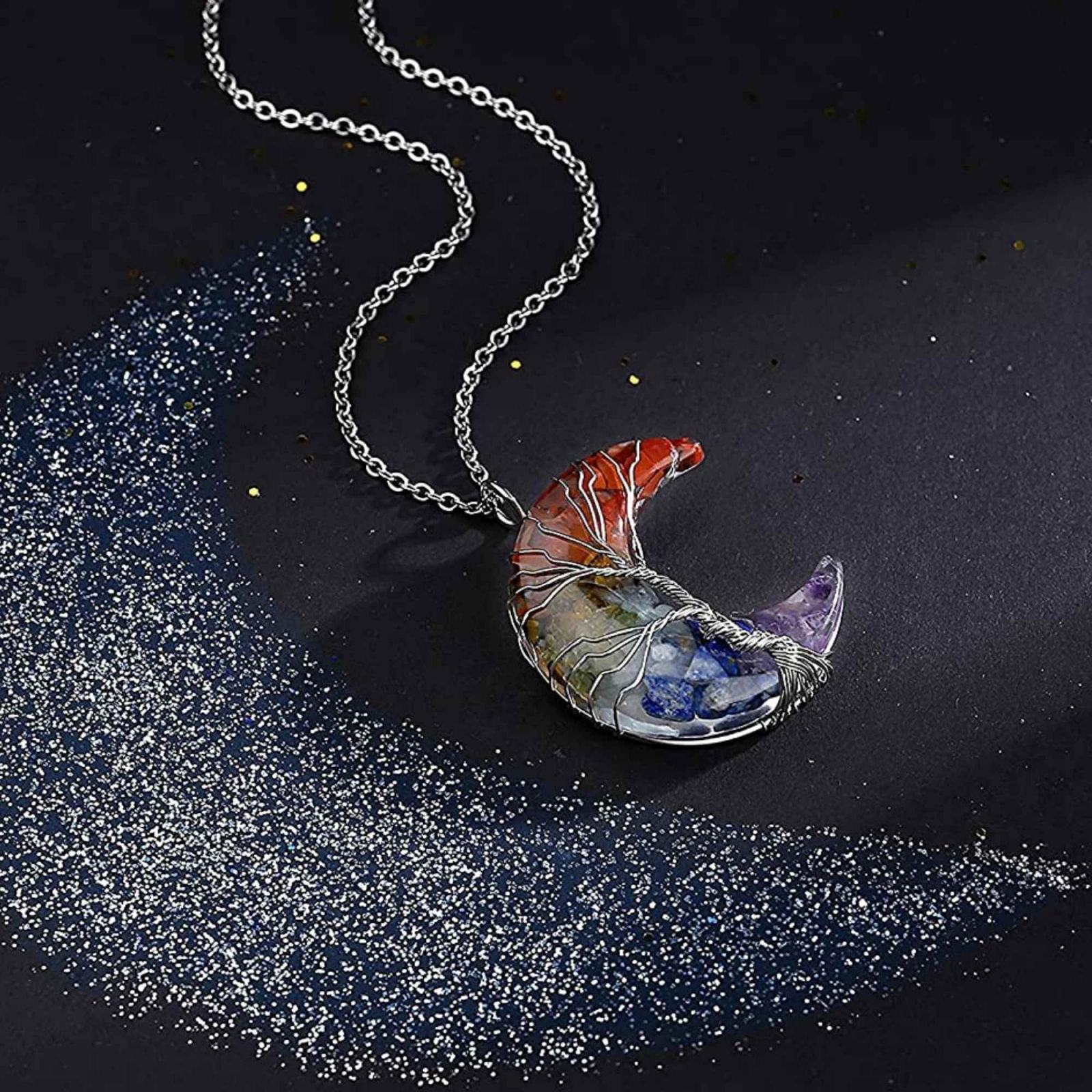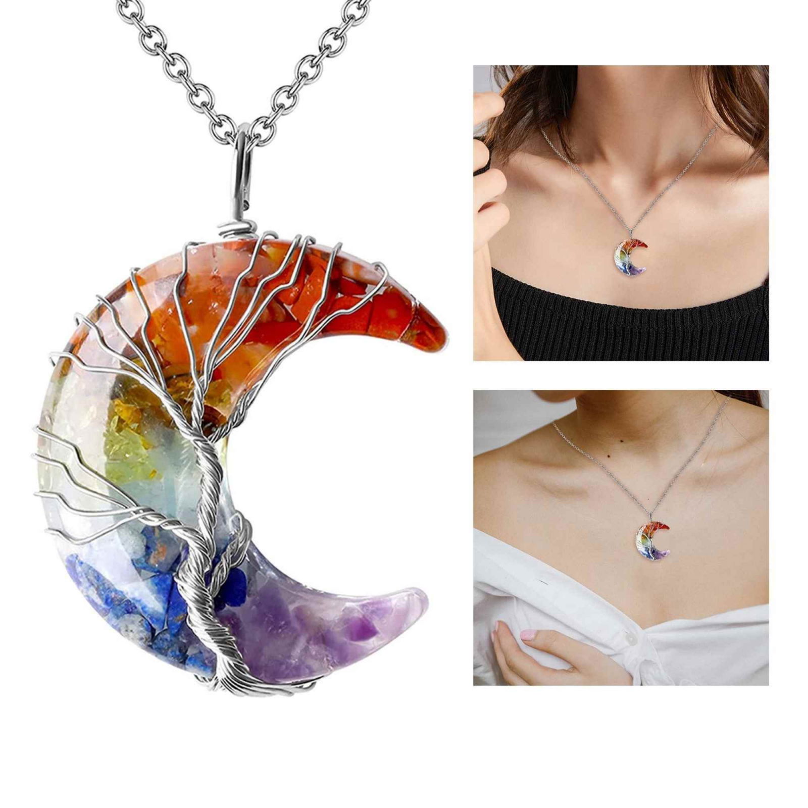 Colier cu pandantiv model semiluna si arborele vietii - Realizat din piatra de cristal polisat cu 7 chakre si rasina naturala