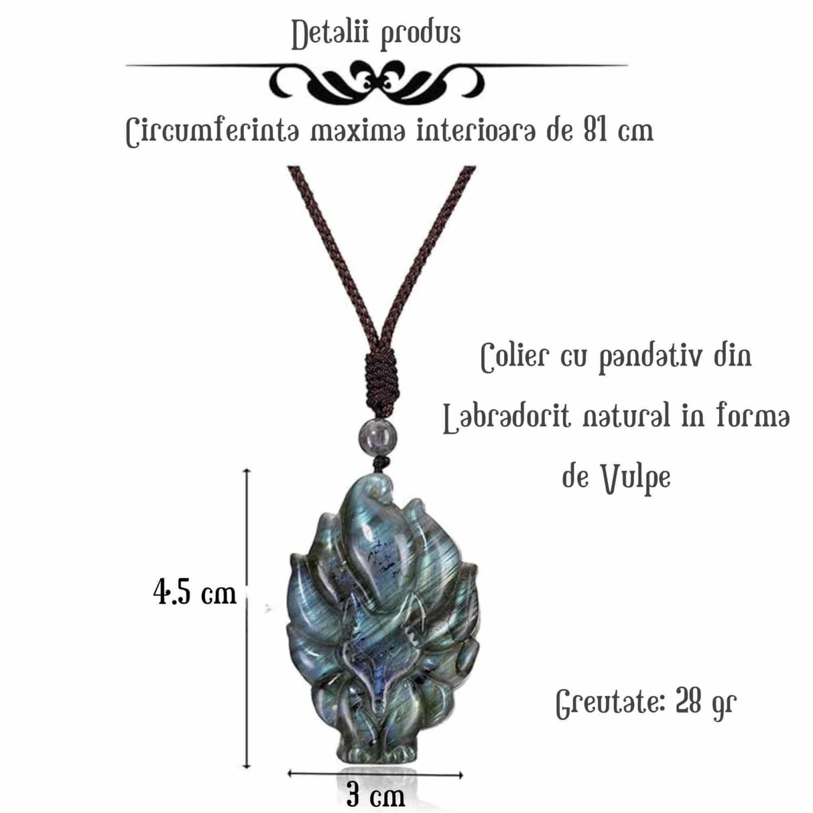 Creat cu maiestrie, acest colier combina eleganta vulpitei cu proprietatile protectoare ale Labradoritului. Fie ca este purtat intr-o ocazie formala sau casual, acesta nu doar ca se armonizeaza perfect cu tinuta, dar si ajuta la conexiunea cu energia Pamantului si protejeaza impotriva energiilor negative.
