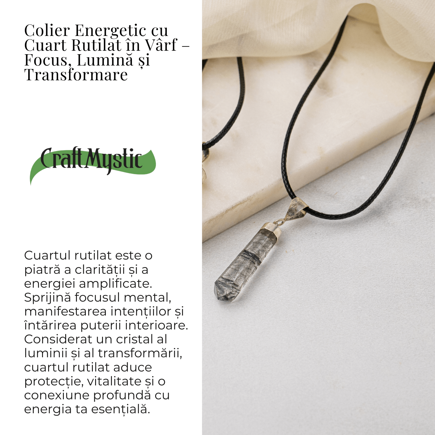 Acest colier cu cuart rutilat în formă de vârf lung este un talisman al clarității mentale și al puterii interioare. Forma de vârf simbolizează direcționarea energiei și manifestarea intențiilor, amplificând fluxul de lumină și protecție.