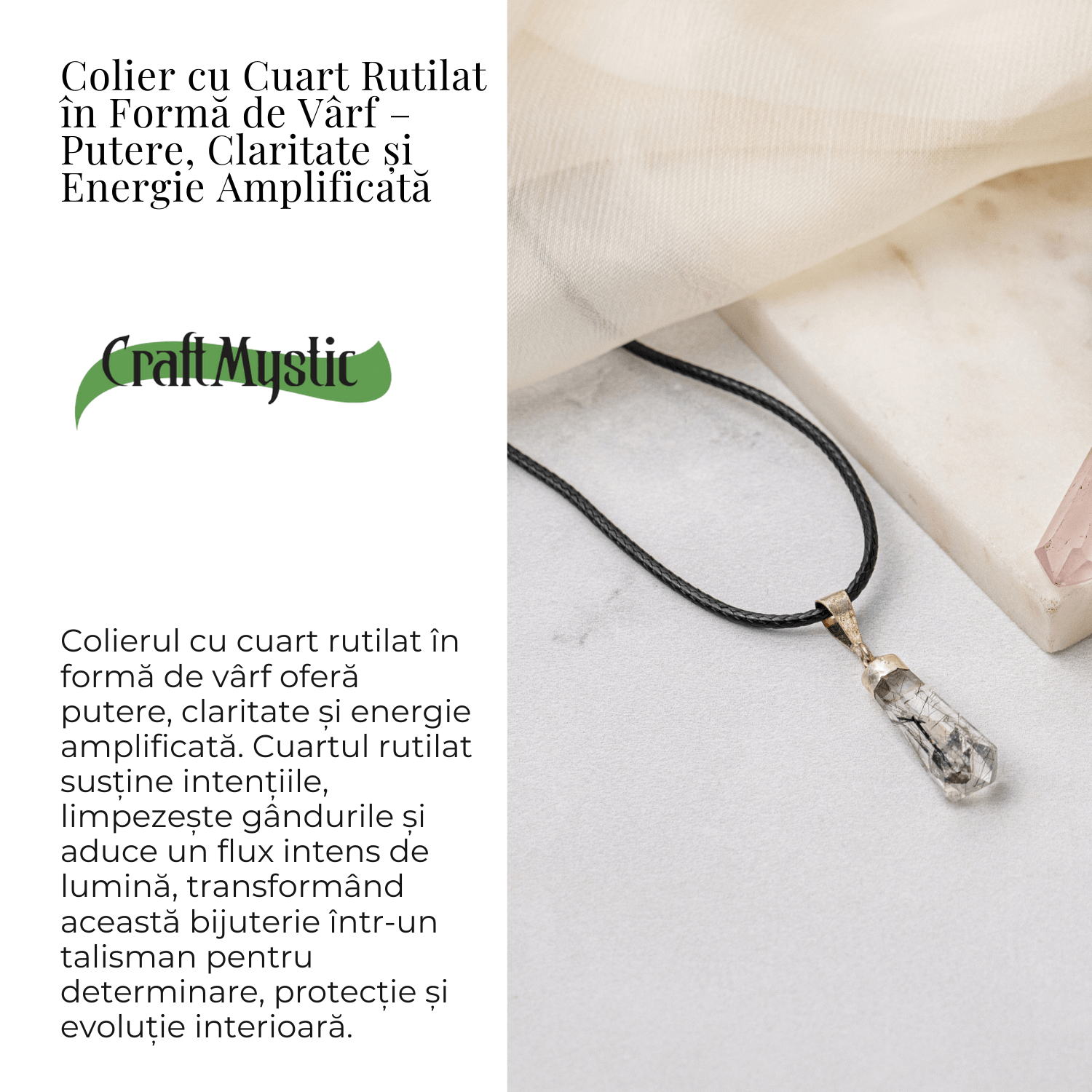 Acest colier cu cuart rutilat în formă de vârf este un talisman al clarității, al energiei amplificate și al intențiilor puternice. Forma de vârf simbolizează direcția, manifestarea și canalizarea energiei către scopul dorit, fiind considerată o geometrie sacrală ce intensifică fluxul energetic.