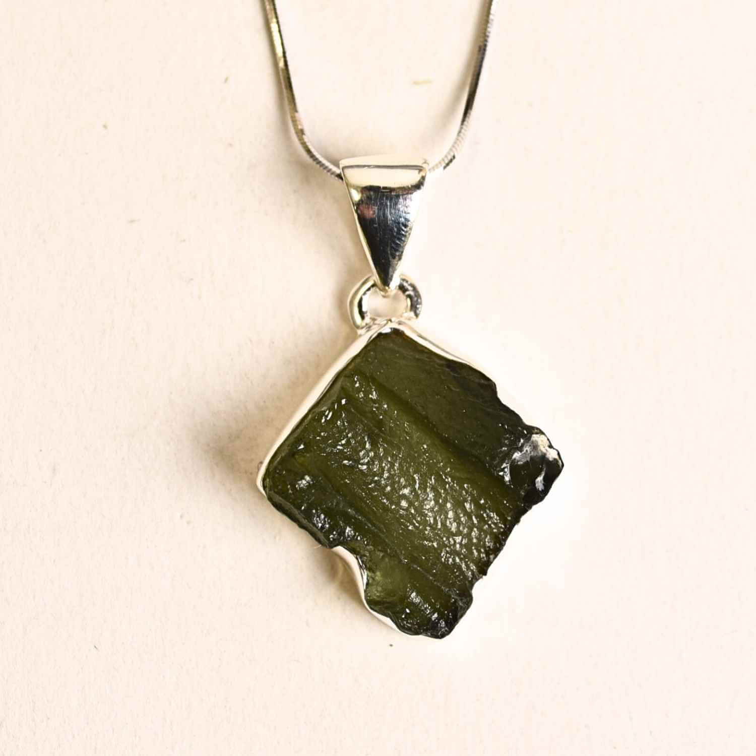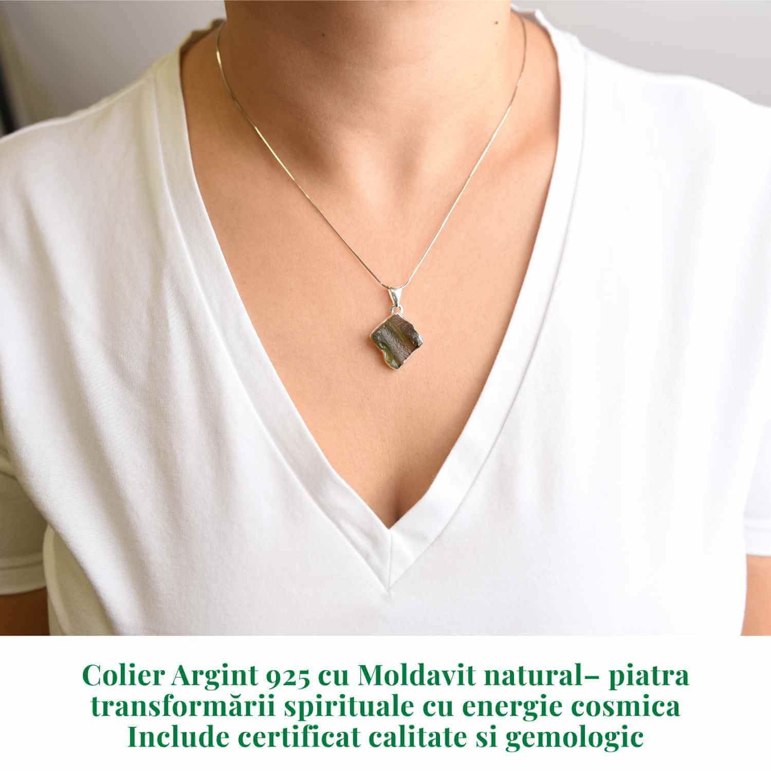 Moldavitul este un cristal rar și fascinant, născut din coliziunea unui meteorit cu Pământul, considerat de secole o piatră a transformării și a protecției. Acest colier elegant din argint 925, cu pandantiv din Moldavit natural brut, poartă în el vibrația Universului, oferind purtătorului energie, claritate și un puternic sprijin spiritual.