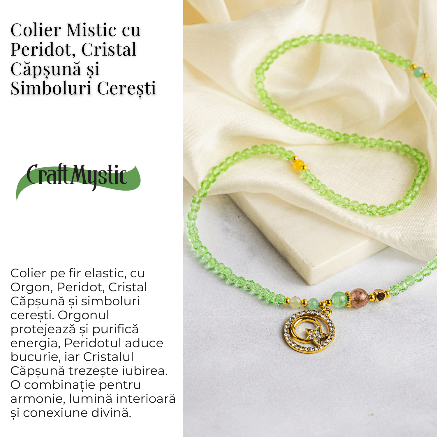 Colier Mistic cu Peridot, Cristal Capsuna si Simboluri Ceresti