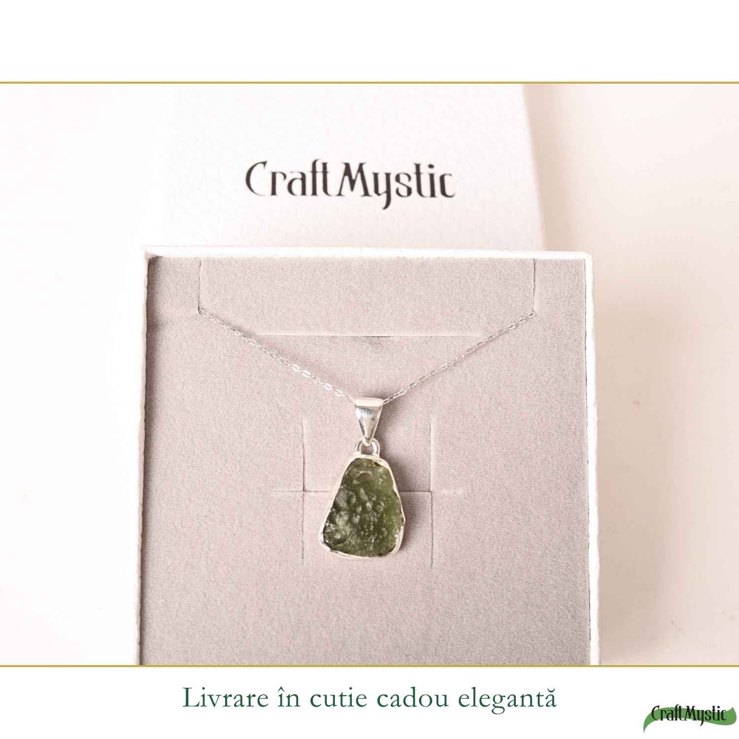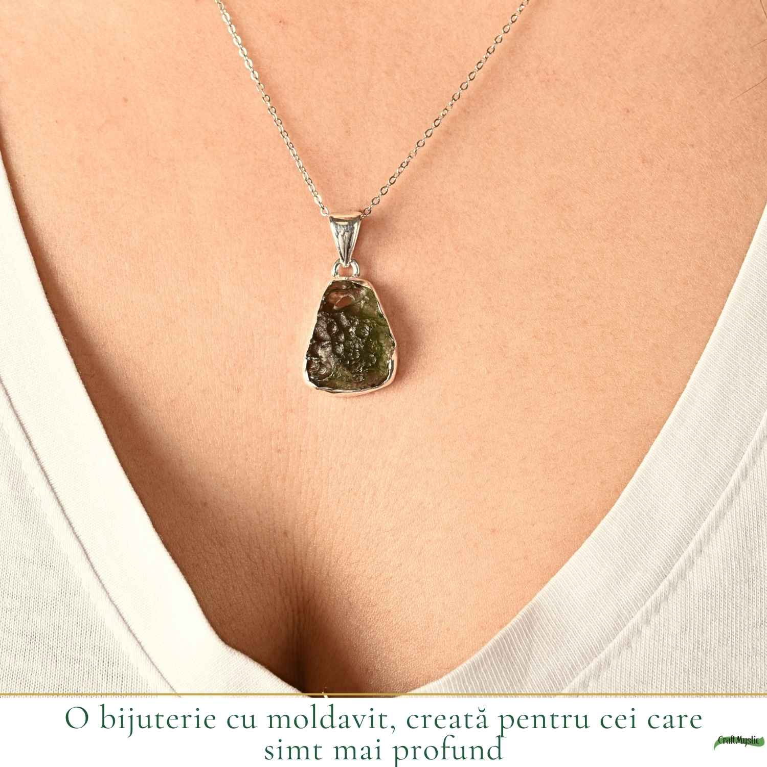 Moldavitul este o piatră rară, de origine cosmică, recunoscută pentru energia sa intensă și transformatoare. Acest colier din argint 925, cu formă brută și neuniformă, îți aduce claritate și autenticitate în momentele de schimbare. Ușor de purtat, dar cu o prezență care se simte.
