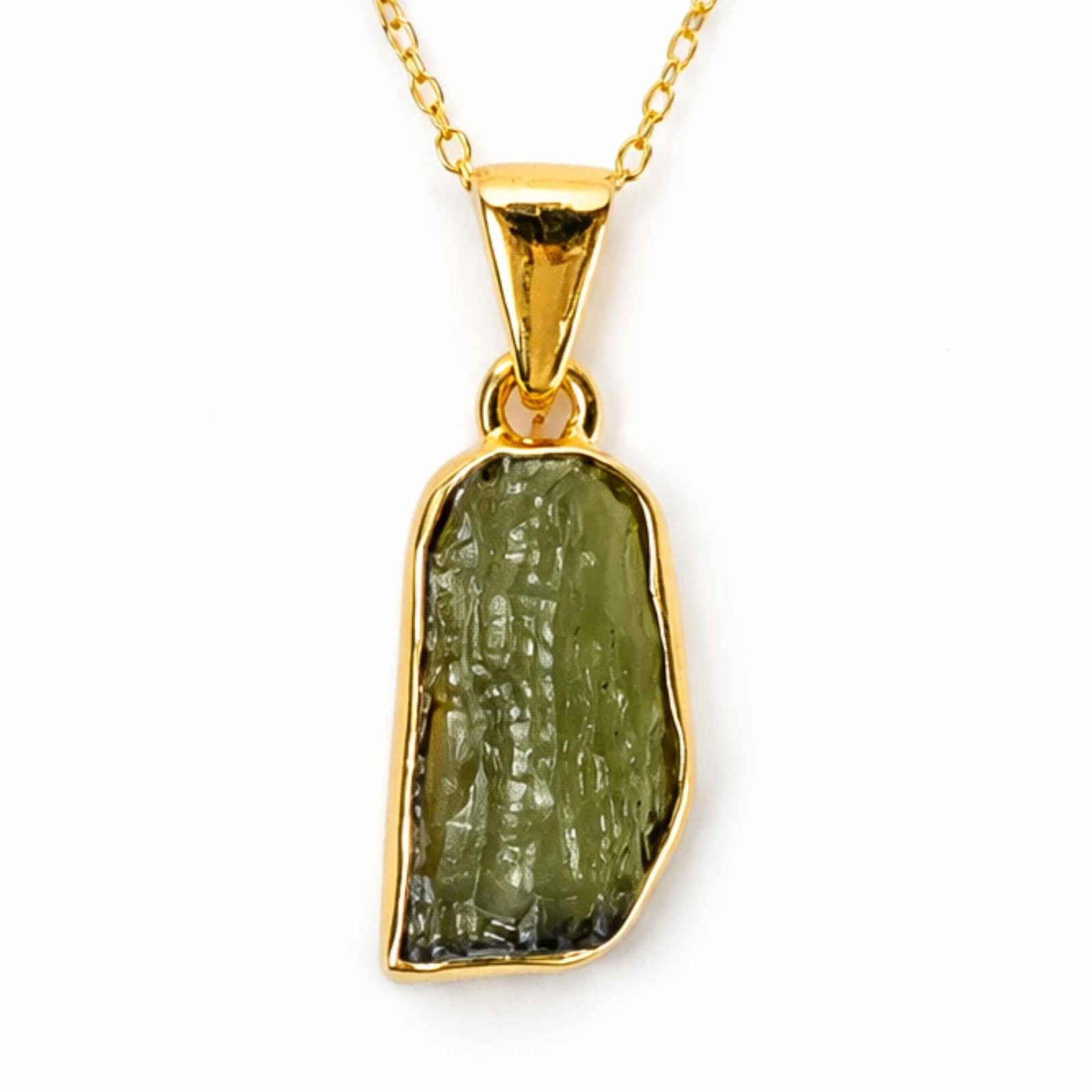 Colier delicat din argint 925 placat cu aur de 18K, cu moldavit brut natural – o piatră rară, cu energie intensă și formă unică. Ușor și plăcut de purtat, devine rapid talismanul tău personal pentru claritate, transformare și autenticitate.