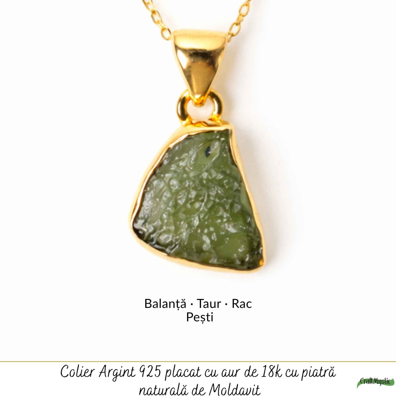 Colier din argint 925 placat cu aur de 18K, cu moldavit brut natural – o piatră rară, cu formă unică și energie intensă. Ușor și confortabil, îl porți zilnic ca simbol al clarității și transformării tale.
