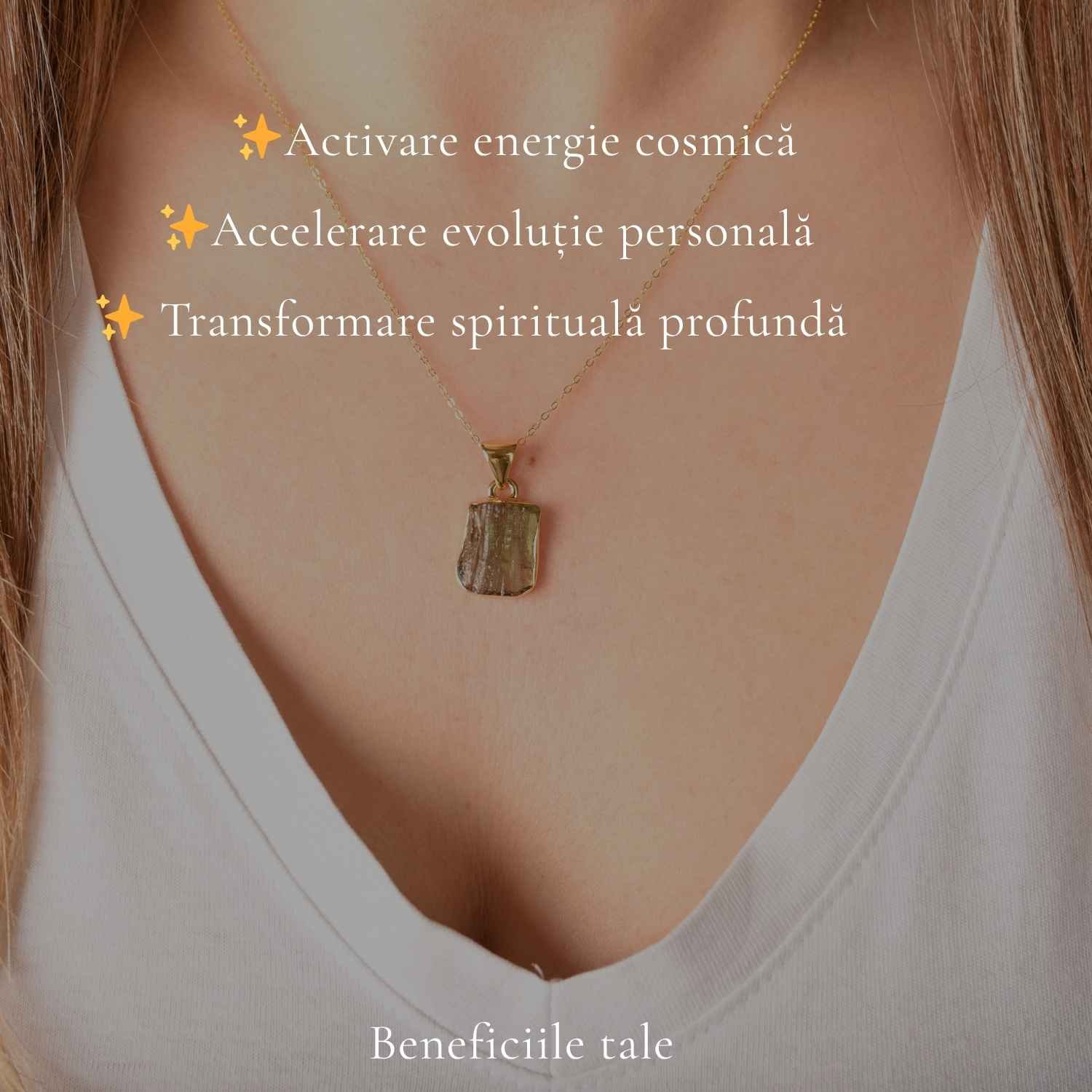Colier din argint 925 placat cu aur de 18K, cu moldavit brut natural – o piatră rară, cu formă unică și energie intensă. Foarte ușor și confortabil, îl porți zilnic ca simbol al clarității și transformării interioare.