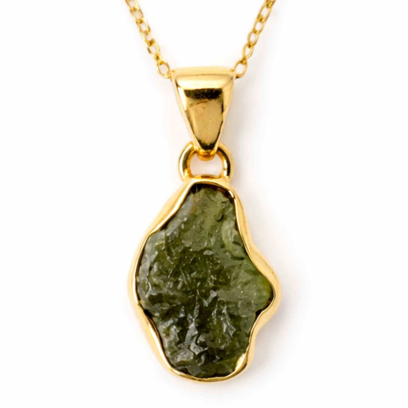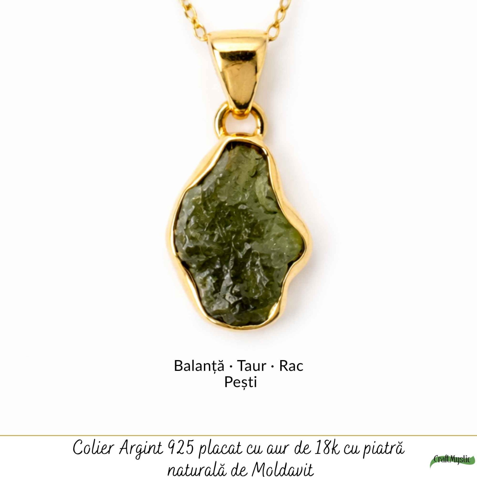 Colier din argint 925 placat cu aur de 18K, cu moldavit brut natural – o piatră rară, cu energie intensă și formă unică. Ușor și plăcut de purtat, devine un talisman discret pentru claritate, transformare și autenticitate.