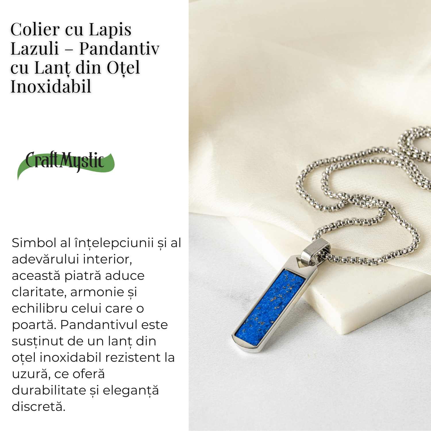 Acest colier elegant cu pandantiv dreptunghiular din Lapis Lazuli natural este un simbol al claritatii si al adevarului interior. Forma dreptunghiulara transmite stabilitate, echilibru si forta mentala, iar albastrul profund al pietrei cu insertii aurii aduce cu sine vibratia intelepciunii si a conexiunii spirituale. Este o bijuterie ce poarta energia armoniei si a sinceritatii, un ghid spre o comunicare deschisa si o viata echilibrata.