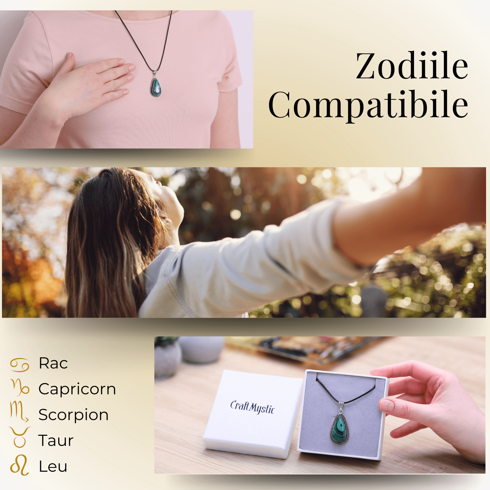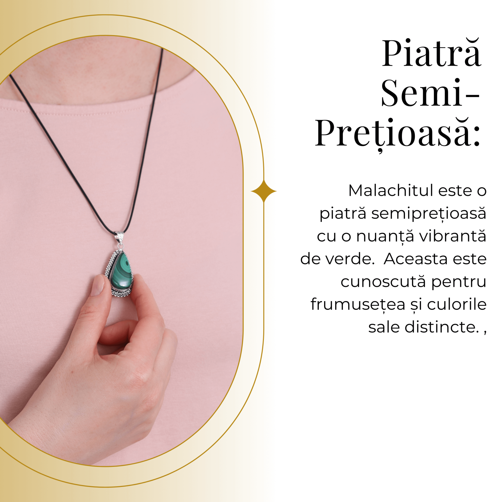 Descriere: Experimentati frumusetea si puterea naturii cu acest colier reglabil, avand un pandantiv elegant in forma de strop de ploaie din malachit natural de 40mm. Perfect pentru iubitorii de pietre semipretioase si pentru cei care apreciaza bijuteriile unice.