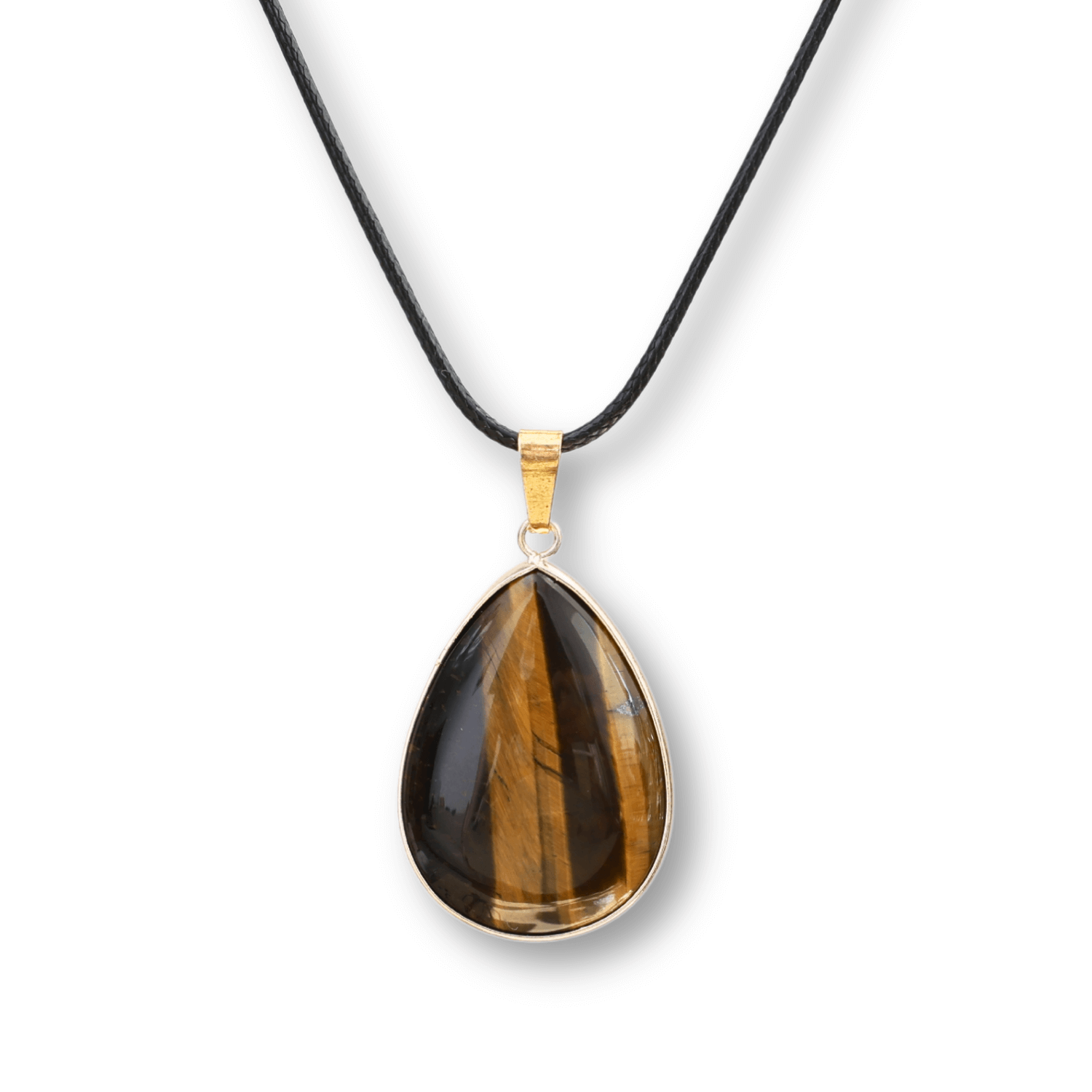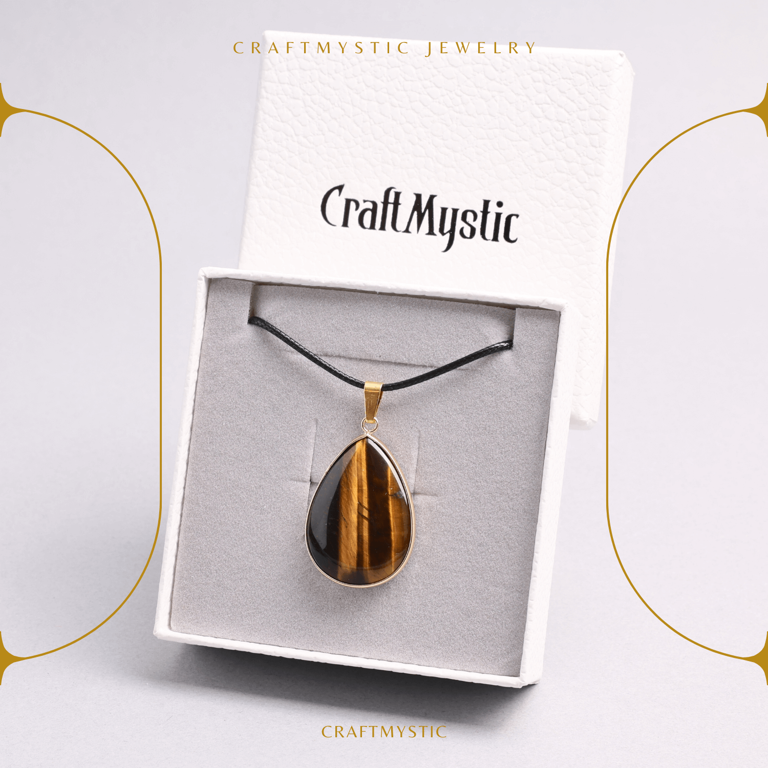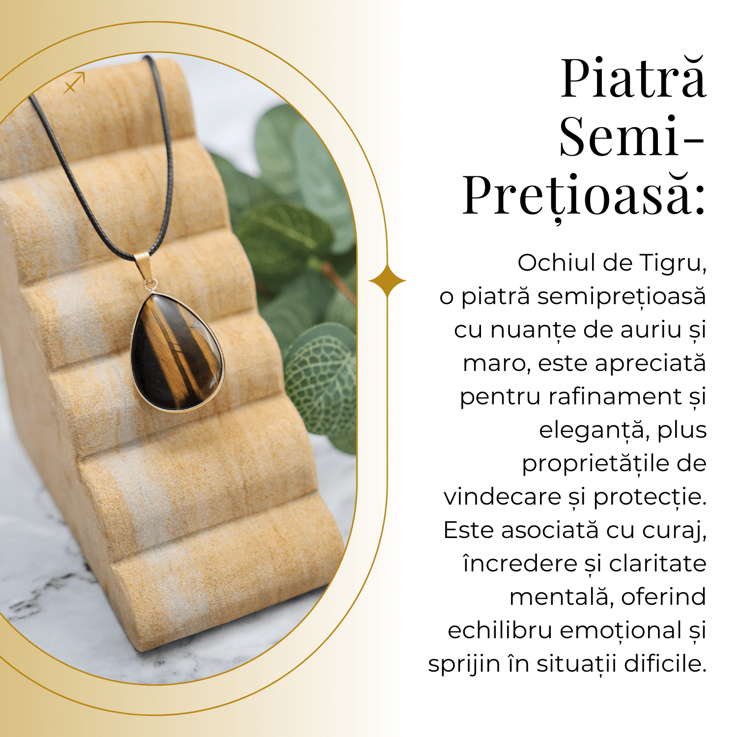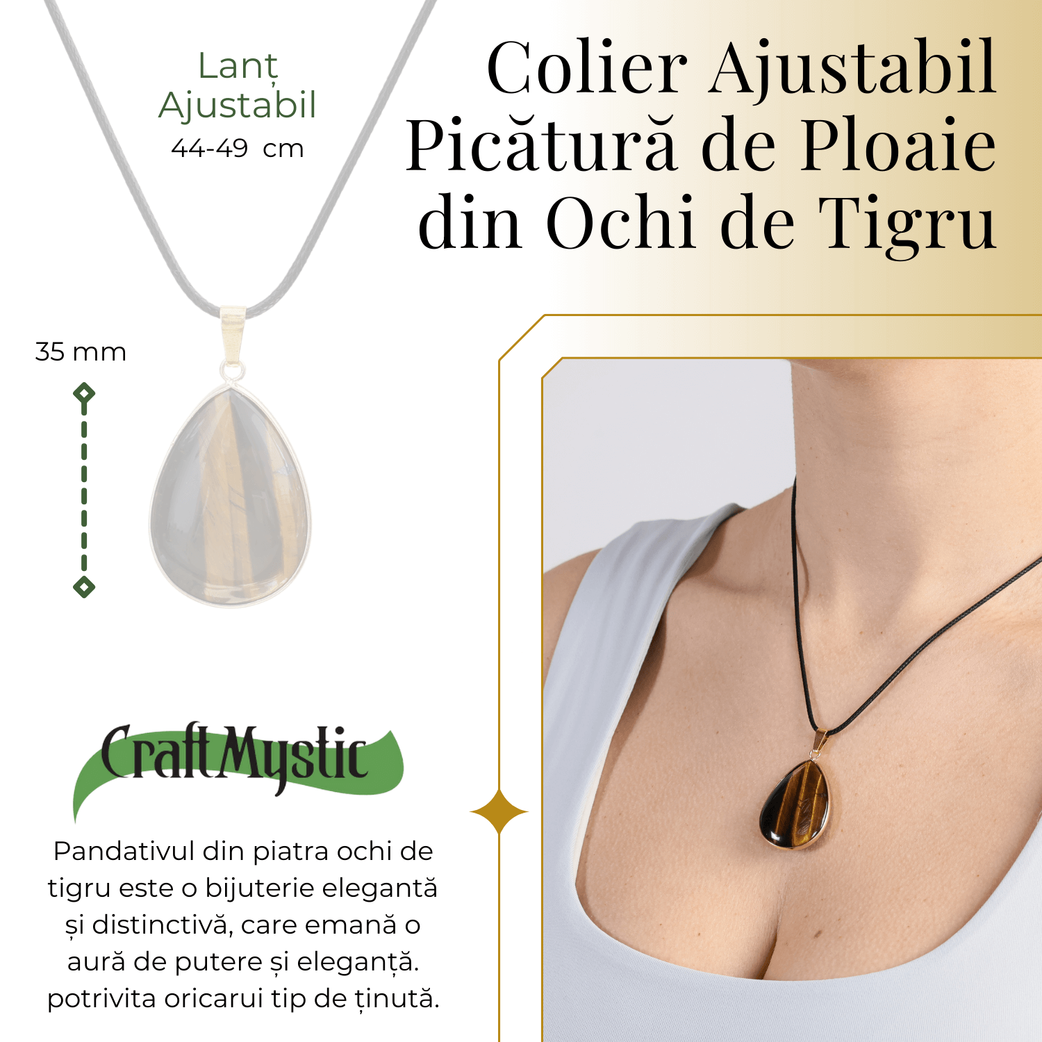 Descriere: Exprimați-vă stilul și conectați-vă cu energia pământului cu acest colier sofisticat, prevăzut cu un pandantiv auriu în formă de strop de ploaie din Ochi de Tigru. Designul unic și reglabil îl face un accesoriu perfect pentru orice ocazie.