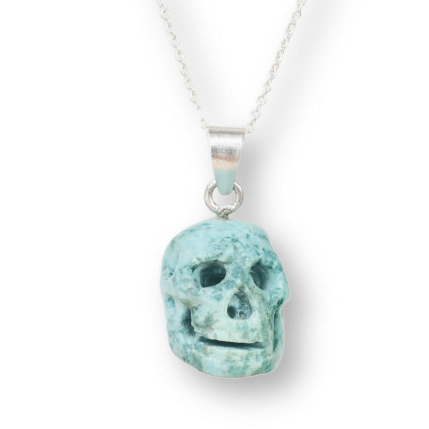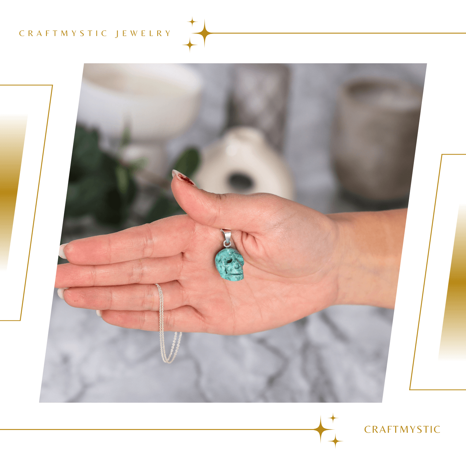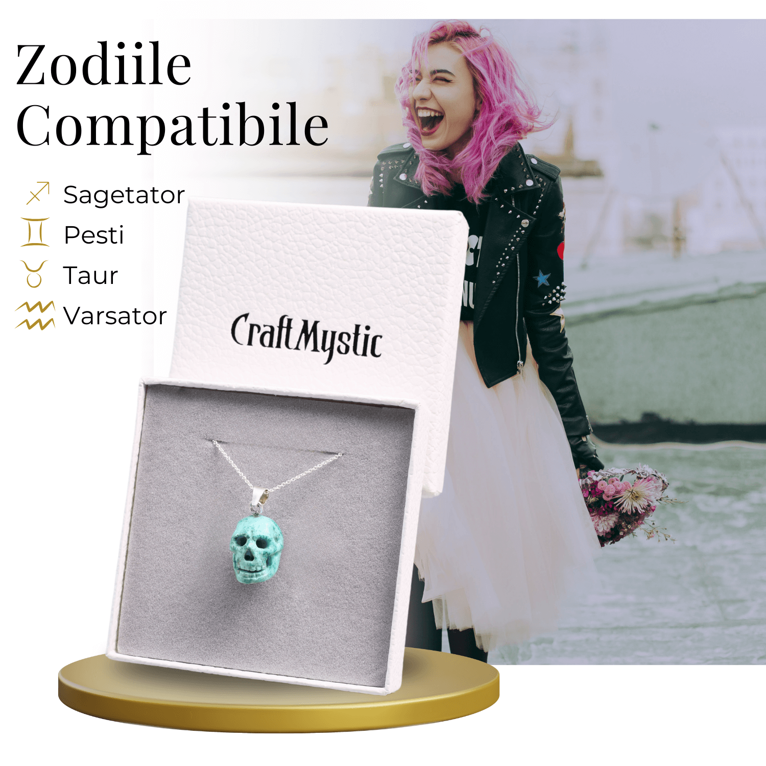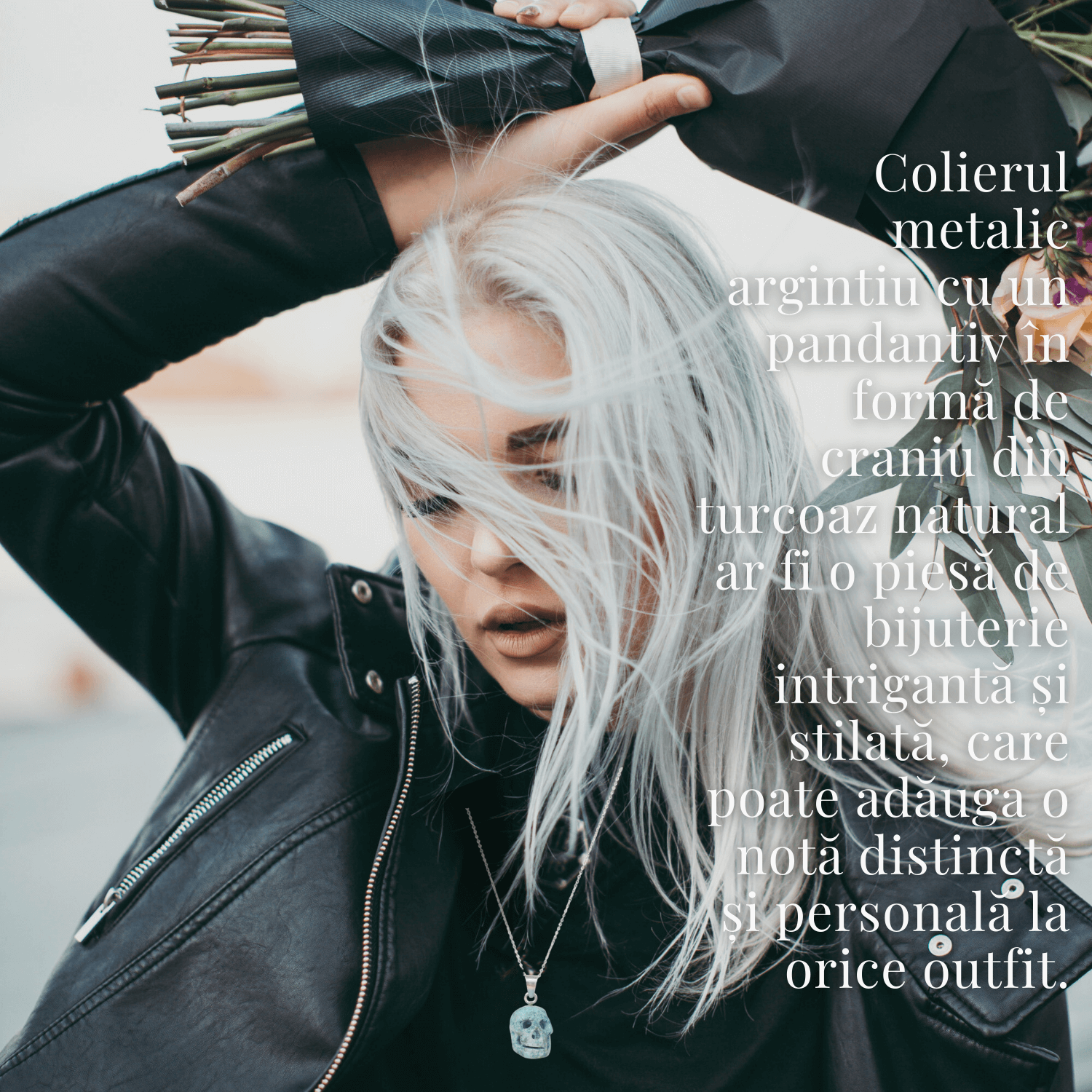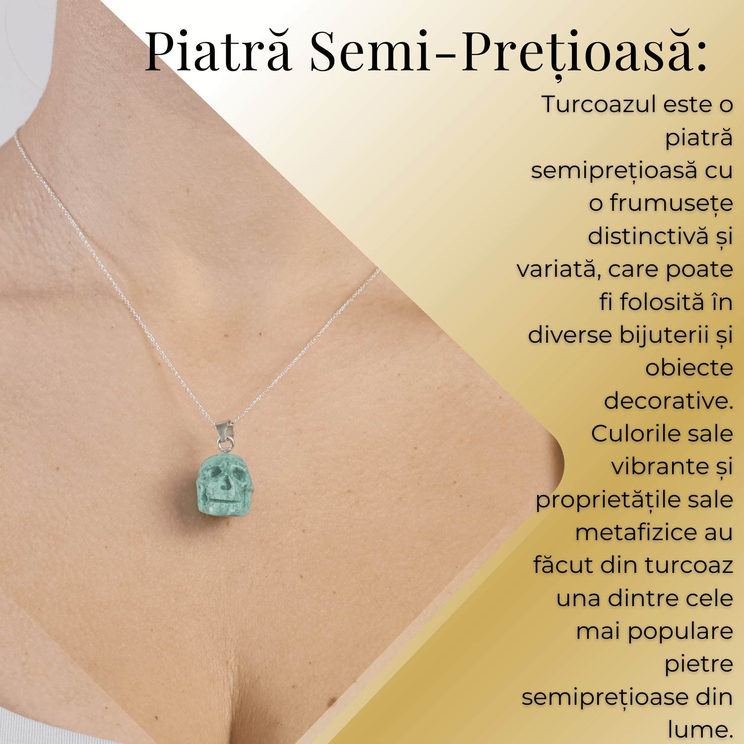 Descriere: Acest colier unic, cu un pandantiv în formă de craniu din Turcoaz natural și agățătoare din argint, este o alegere perfectă pentru cei care caută un accesoriu cu personalitate și semnificație.