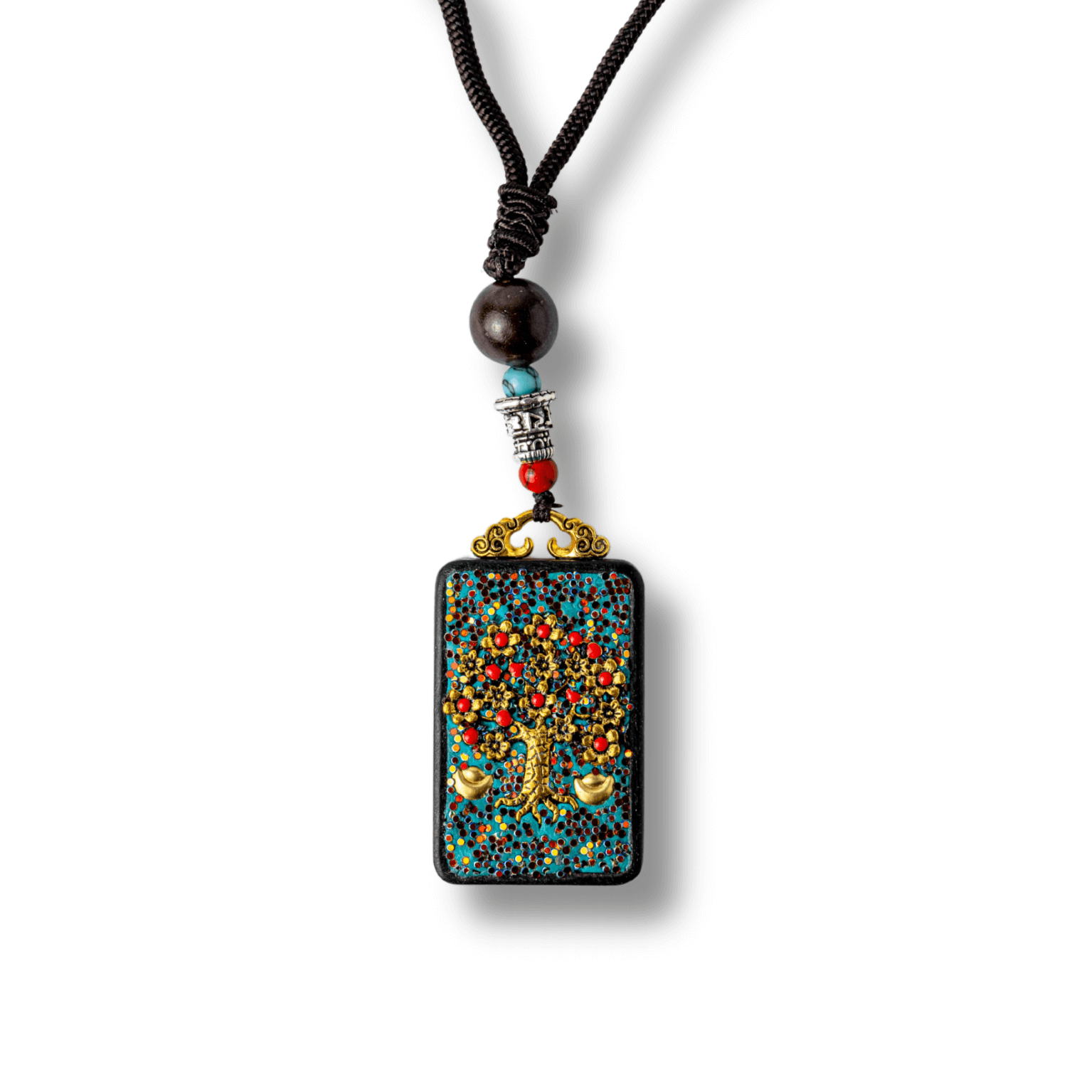 Acest colier Thangka nepalez este o adevarata opera spirituala, sculptata manual din lemn de abanos si decorata cu mărgele colorate in stil tibetan.