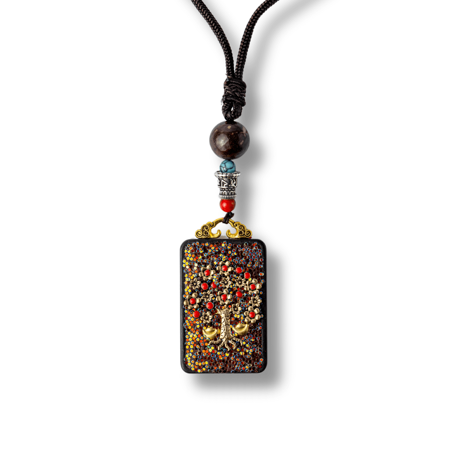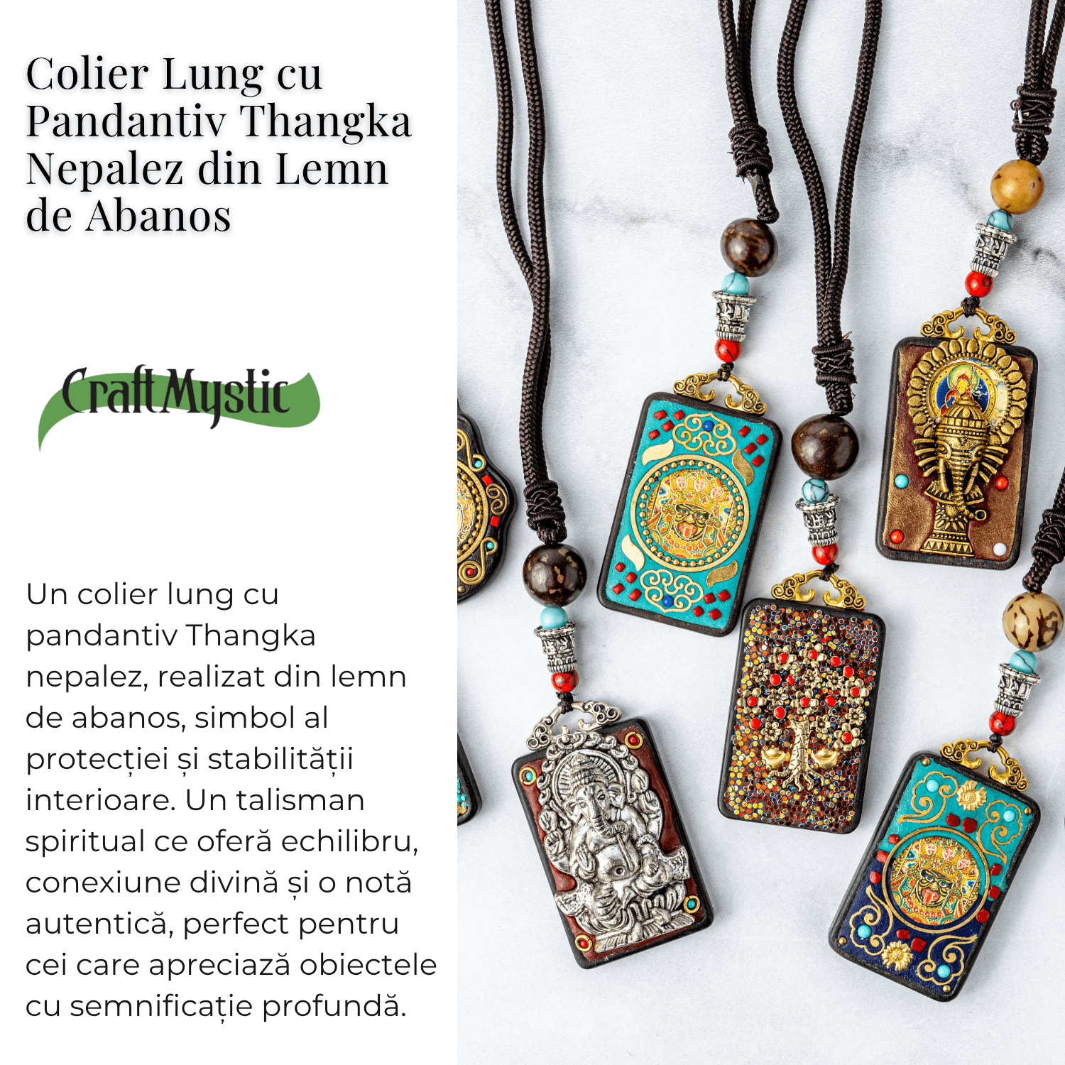 Un colier creat ca o rugaciune purtata aproape de inima – acest pandantiv Thangka nepalez din lemn de abanos sculptat manual infatiseaza Arborele Vietii, simbolul sacru al interconectarii divine si al renasterii continue.