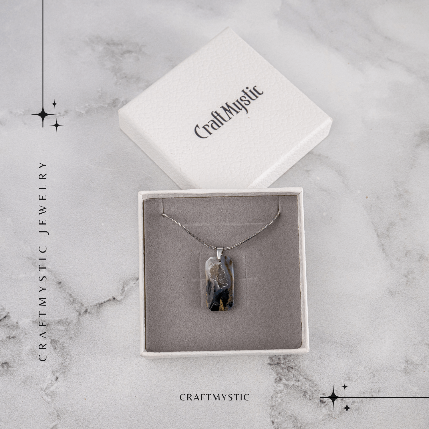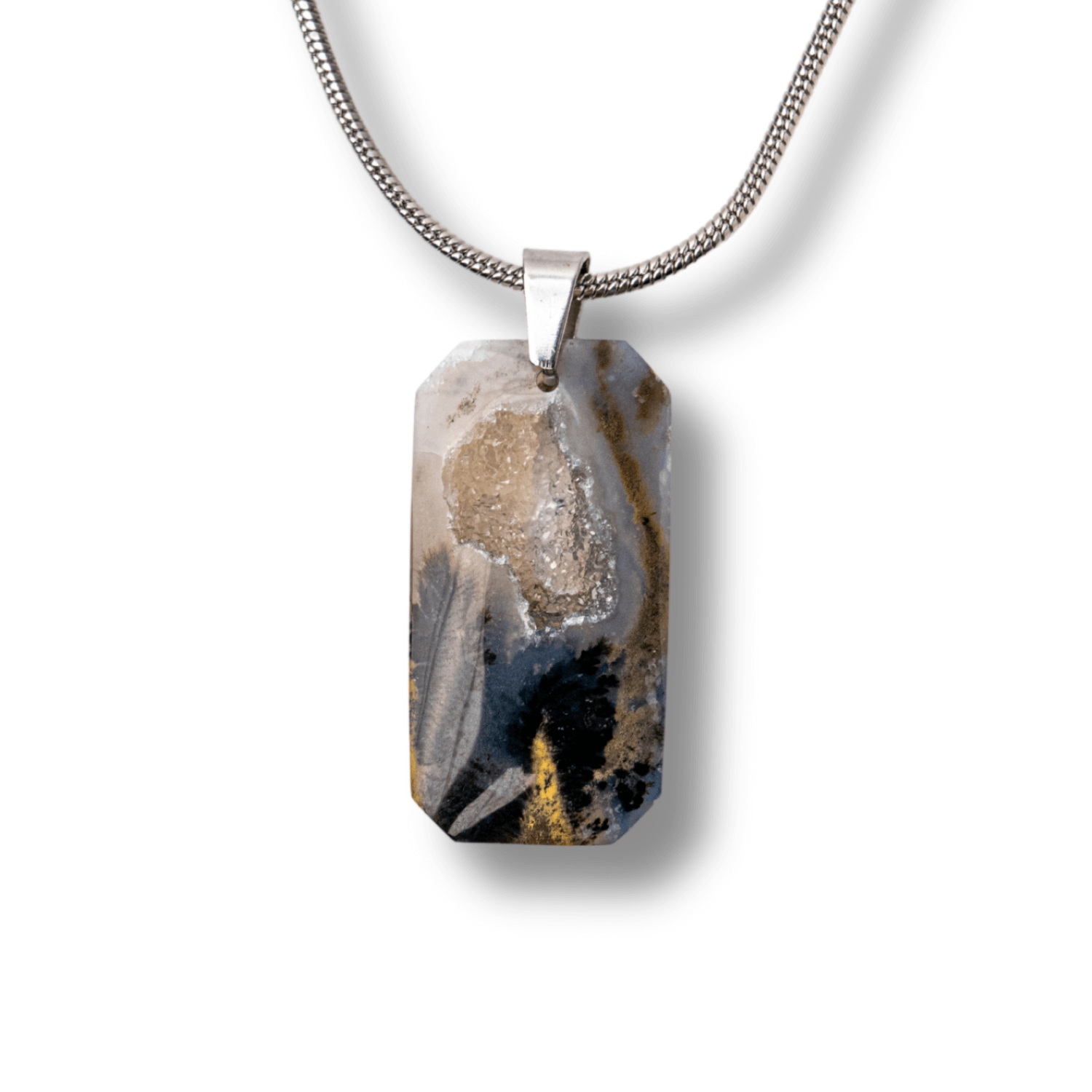 Colierul cu Agat Dendritic în formă dreptunghiulară aduce o vibrație organică, liniștitoare și profund conectată cu natura. Forma dreptunghiulară simbolizează stabilitatea, structura și echilibrul interior, iar agatul dendritic – cu incluziuni ce amintesc de frunze sau ramuri – este considerat o piatră a legăturii cu pământul, creșterii personale și armoniei subtile.