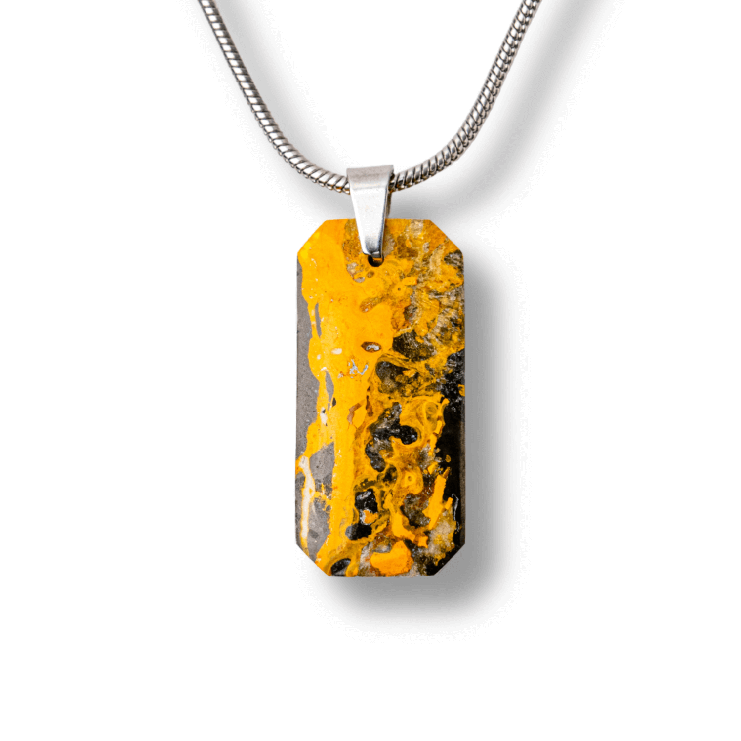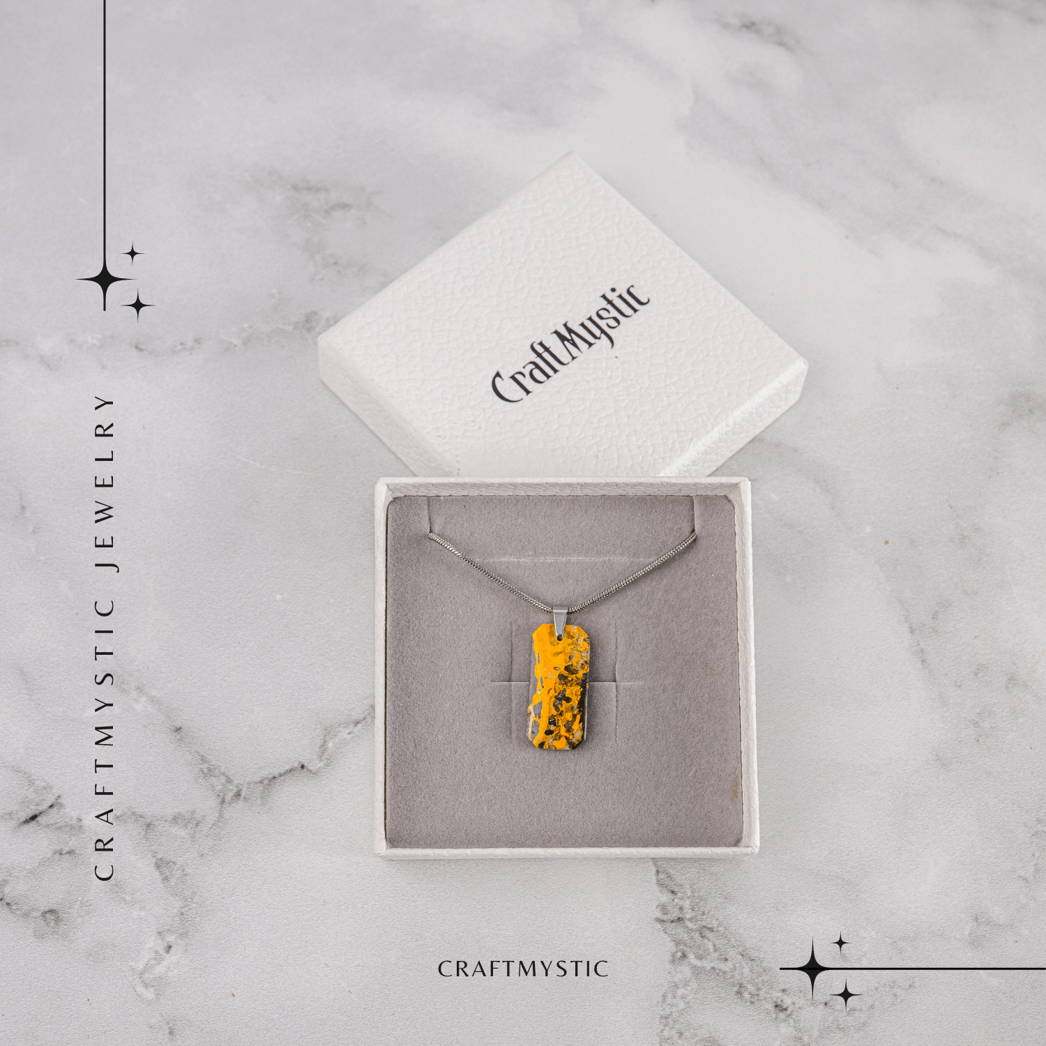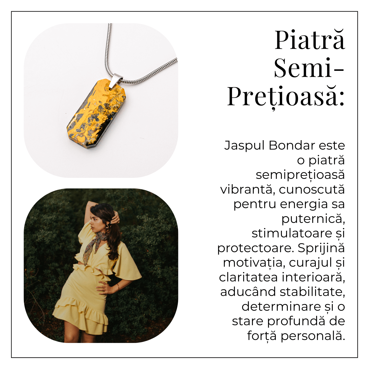 Jaspul Bondar este o piatră spectaculoasă, recunoscută pentru nuanțele sale galben-negru care simbolizează vitalitatea, determinarea și trezirea focului interior. Forma dreptunghiulară reprezintă stabilitate, echilibru și direcție clară în viață, transformând colierul într-un talisman de motivație și curaj.