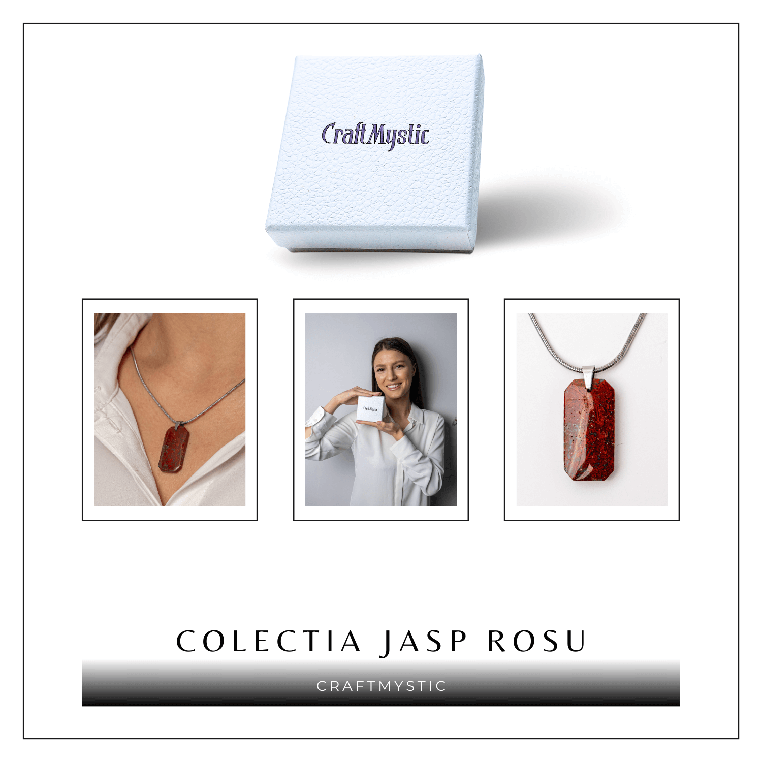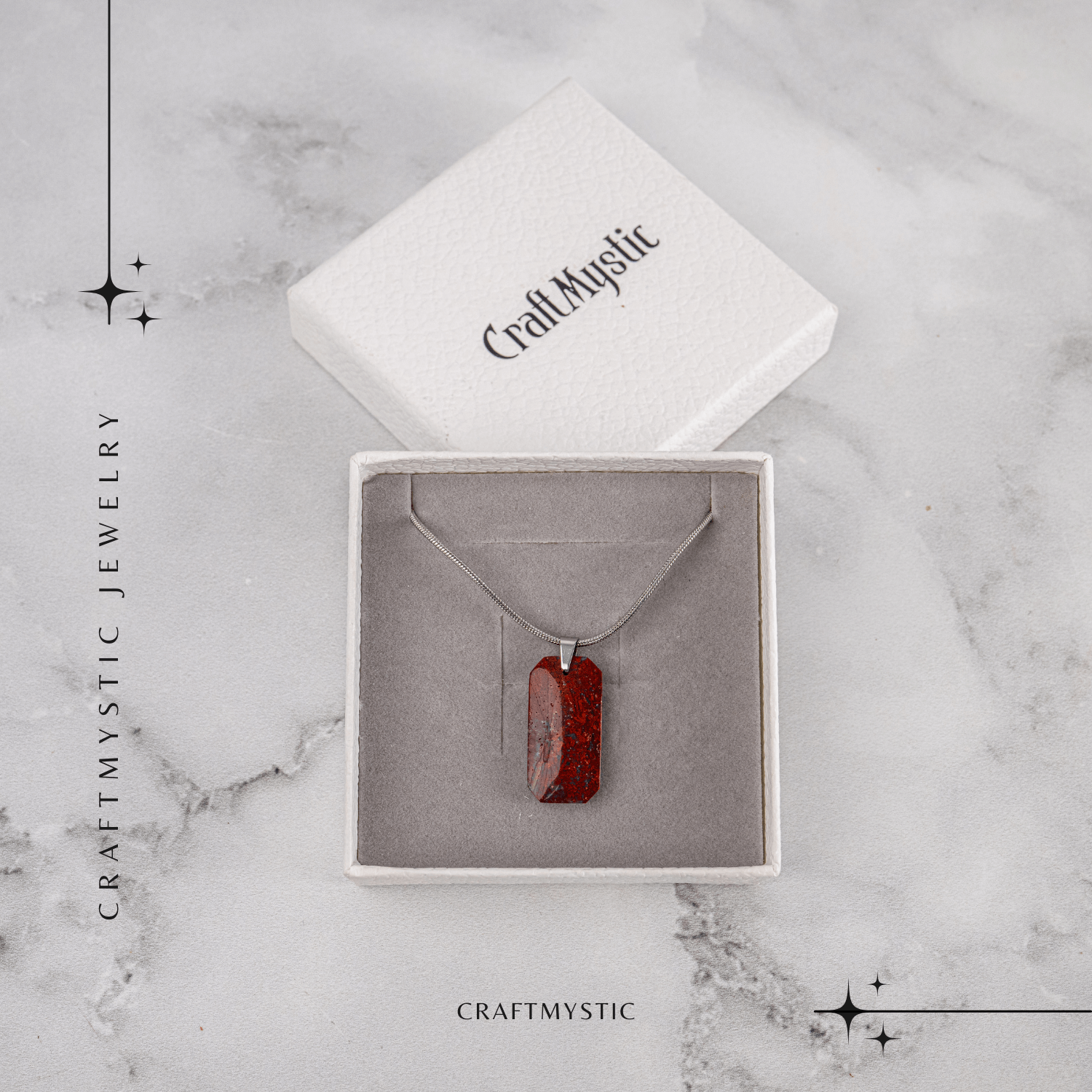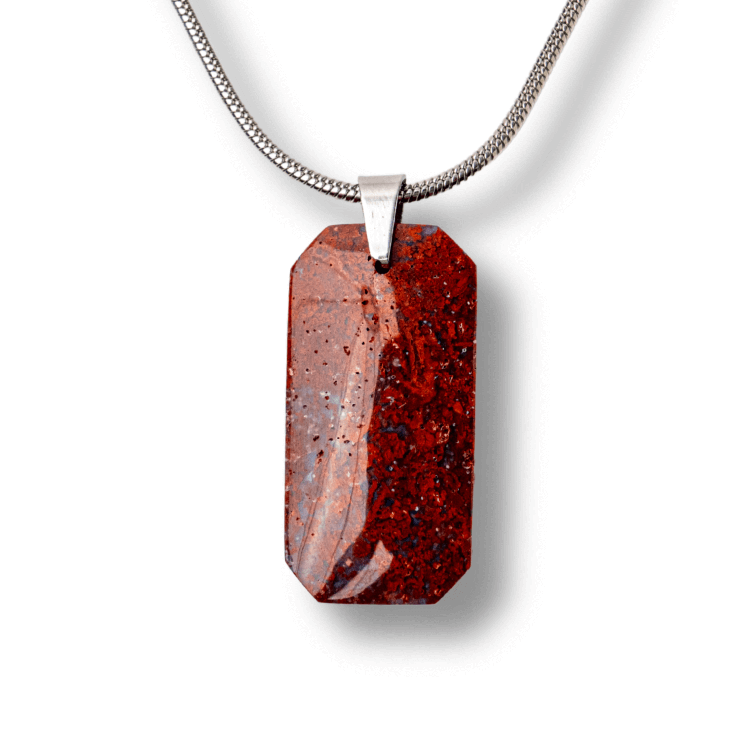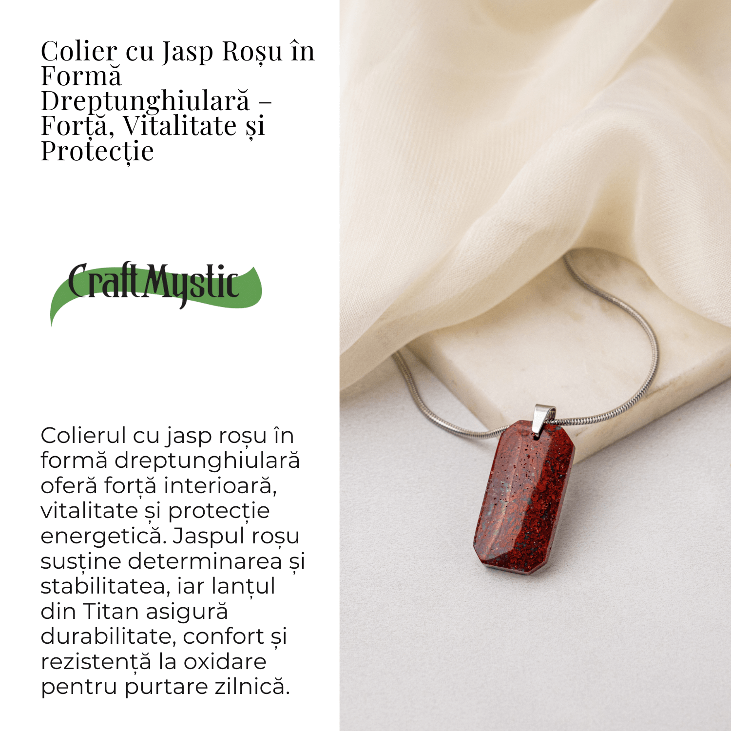 Acest colier cu Jasp Rosu natural si pandantiv dreptunghiular emana forta, stabilitate si protectie energetica.