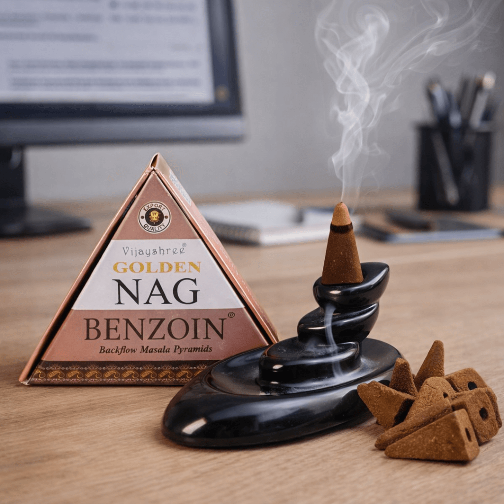 Conuri Parfumate Backflow Golden Nag Benzoin – Piramida Sacra pentru Protectie si Purificare Energetica