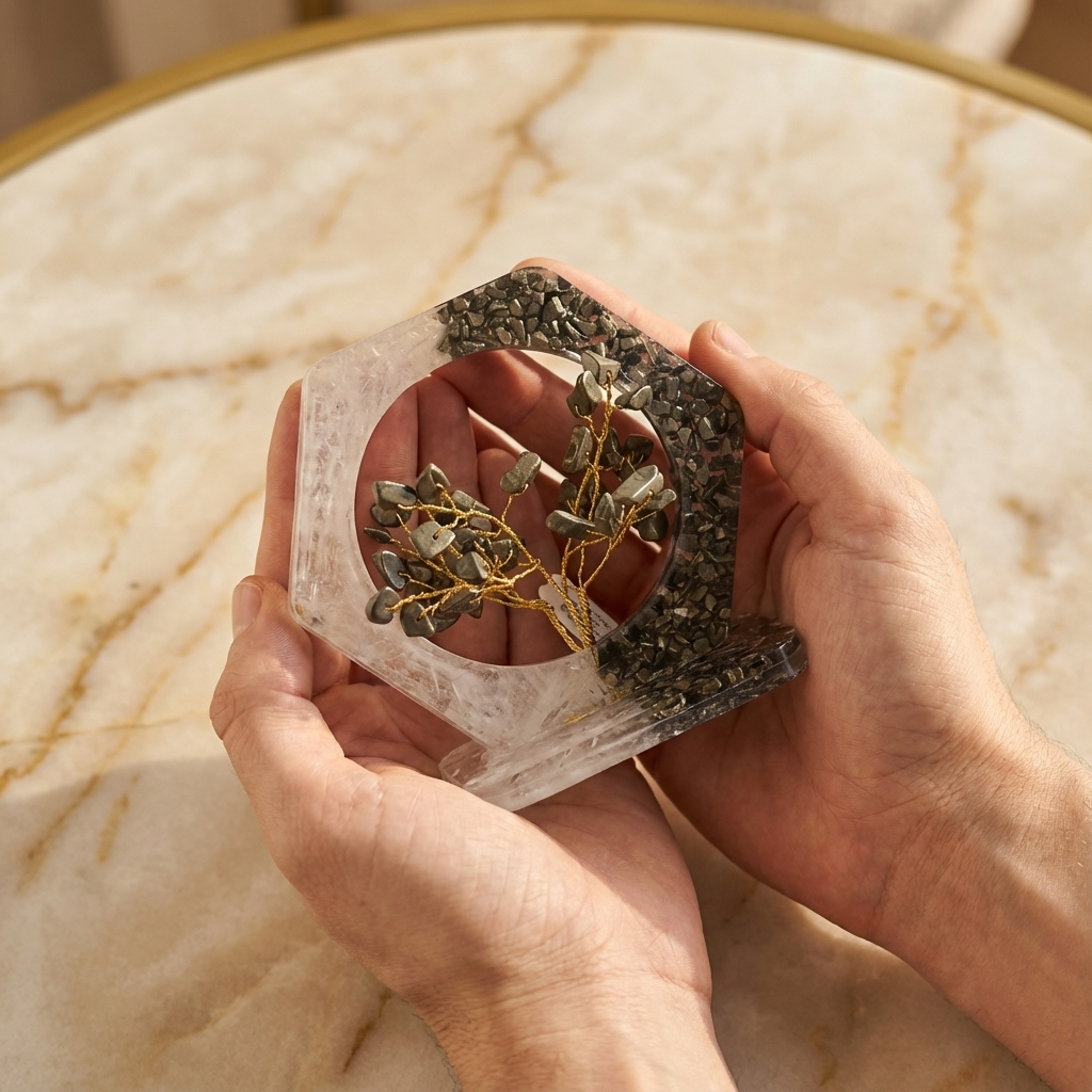 Un copăcel care aduce ordine, protecție și lumină. Combinația dintre pirita și selenit îți ține mintea limpede, energia curată și spațiul în armonie — exact acolo unde ai nevoie cel mai mult.