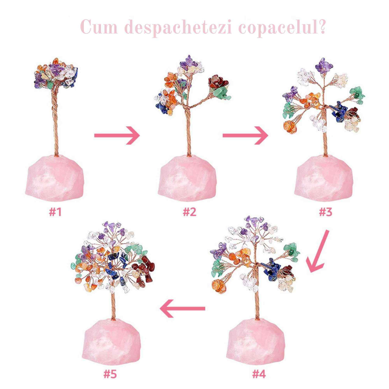 • Copacel din 7 Pietre Naturale Chakra: Acest copacel unic este realizat manual din 7 tipuri de cristale naturale, reprezentand cele 7 chakre, dispuse pe un suport din cristal natural. Cu o inaltime de 12-13 cm, este un accesoriu decorativ ce aduce o nota de eleganta si rafinament in orice spatiu;