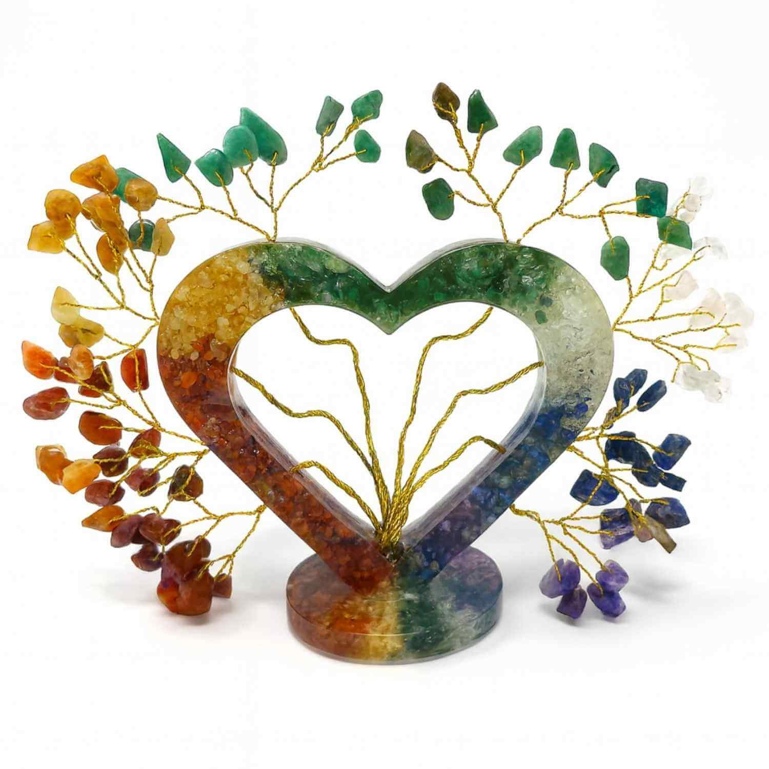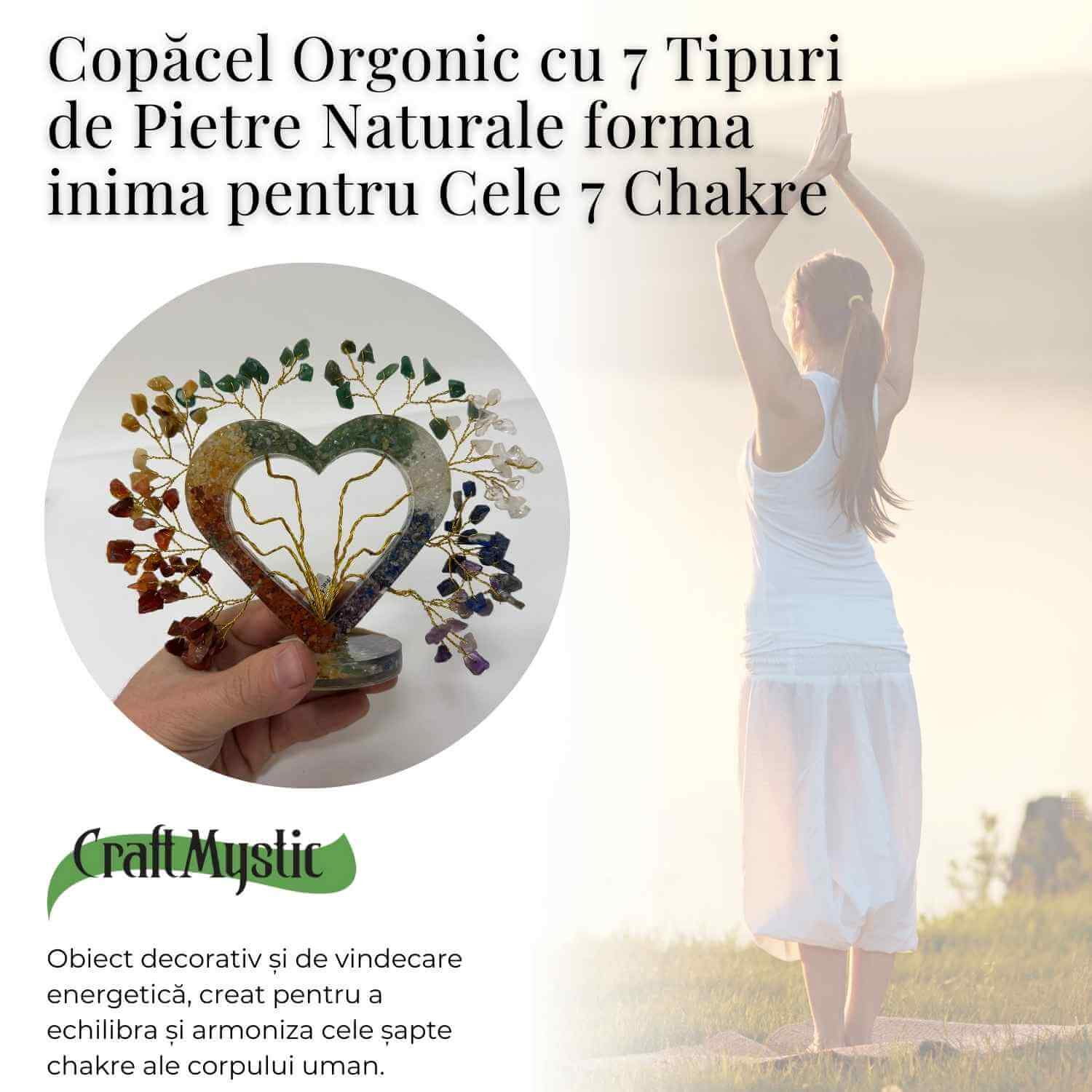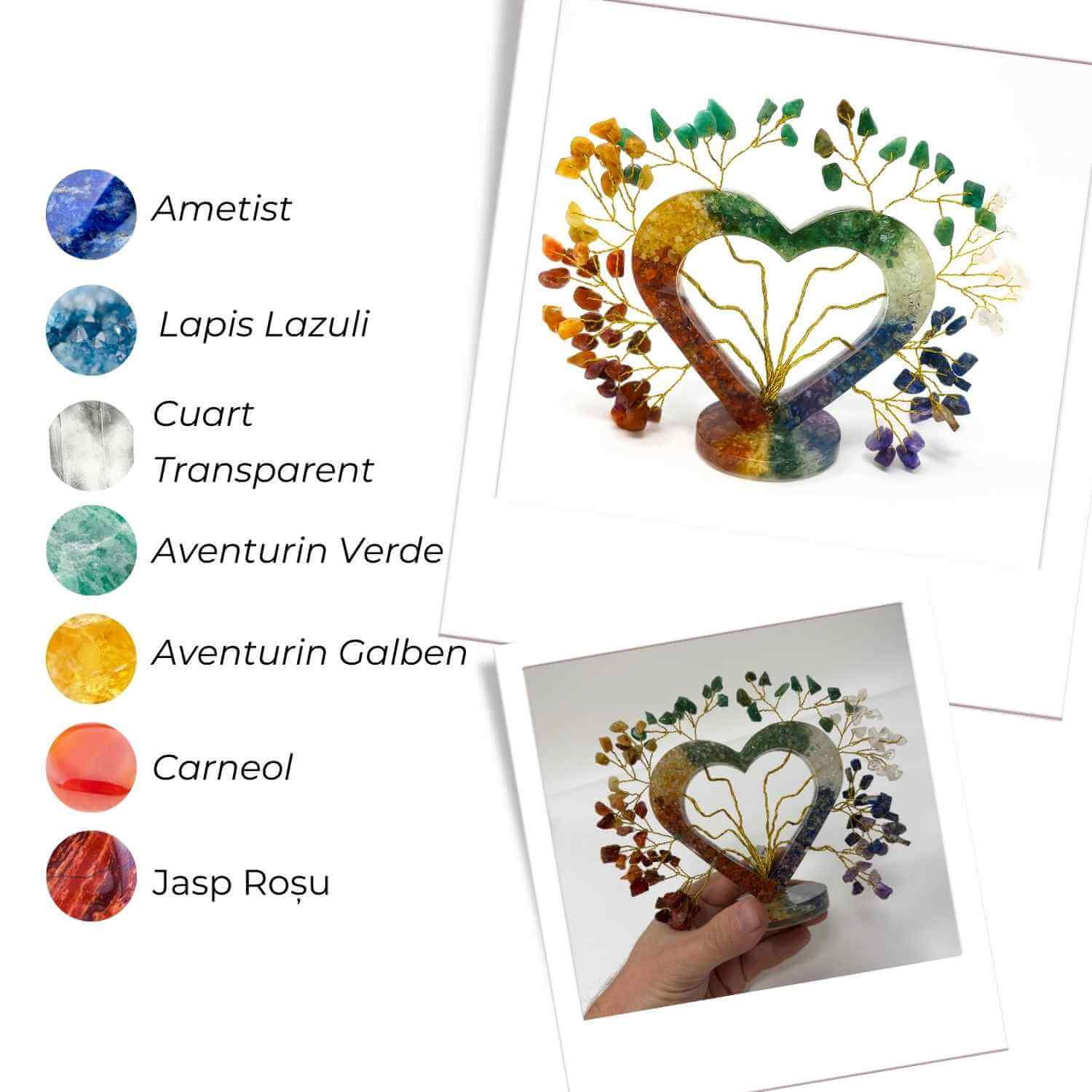 O piesă decorativă cu energie blândă, creată pentru a aduce armonie, echilibru și frumos în orice spațiu. Acest copăcel orgonic în formă de inimă este realizat manual din rășină transparentă, sârmă aurie și 7 tipuri de cristale naturale, fiecare corespondent unei chakre.