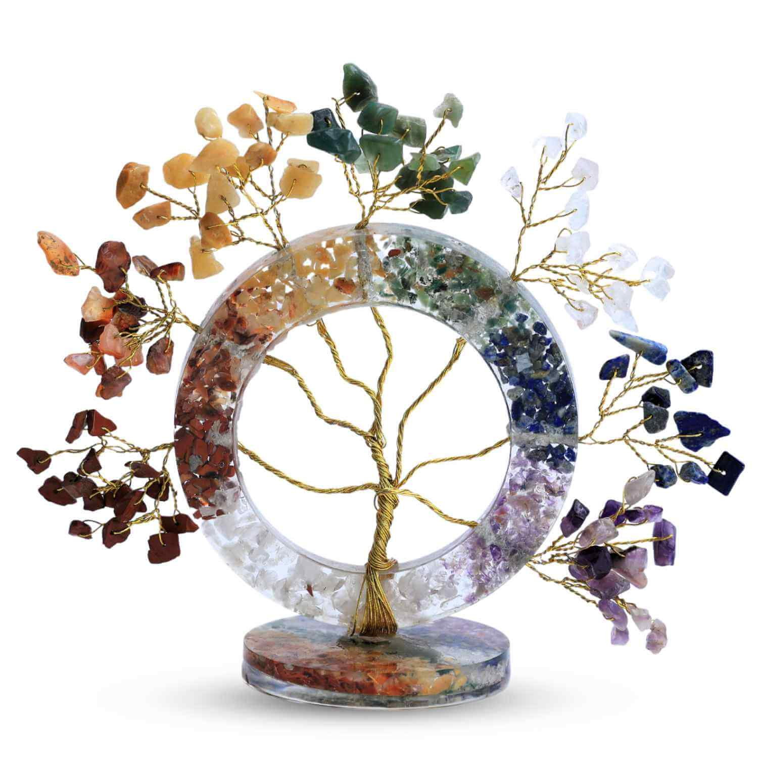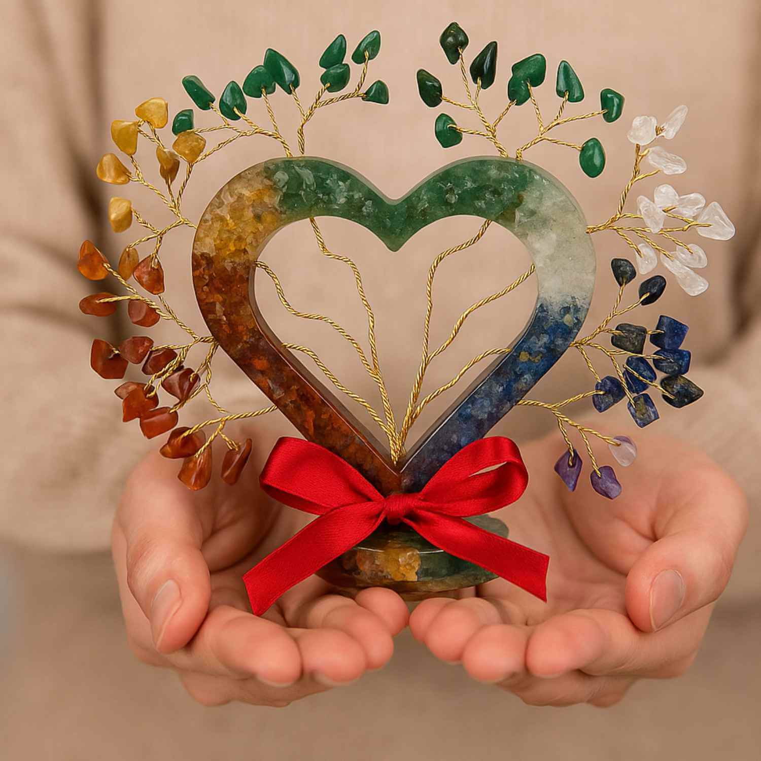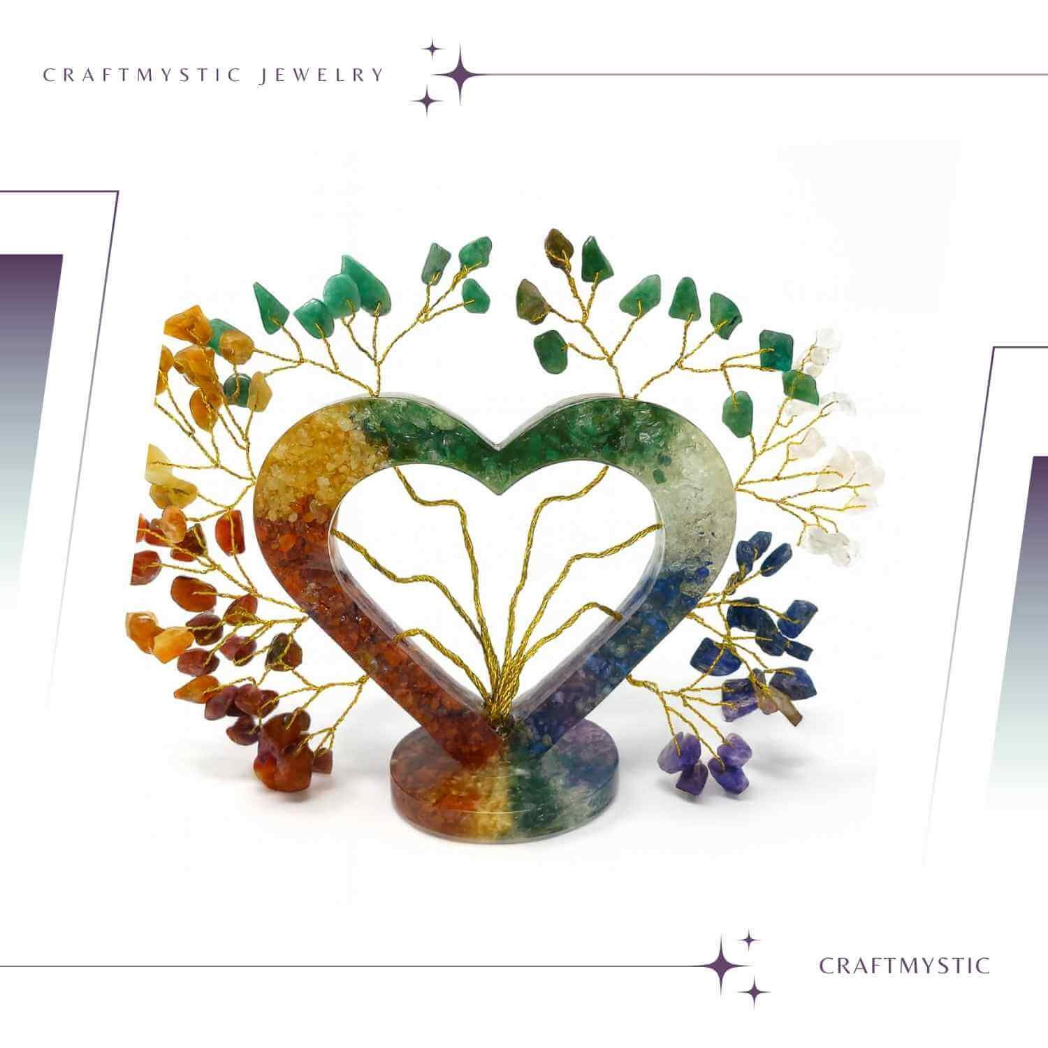 O piesă decorativă cu energie blândă, creată pentru a aduce armonie, echilibru și frumos în orice spațiu. Acest copăcel orgonic în formă de inimă este realizat manual din rășină transparentă, sârmă aurie și 7 tipuri de cristale naturale, fiecare corespondent unei chakre.