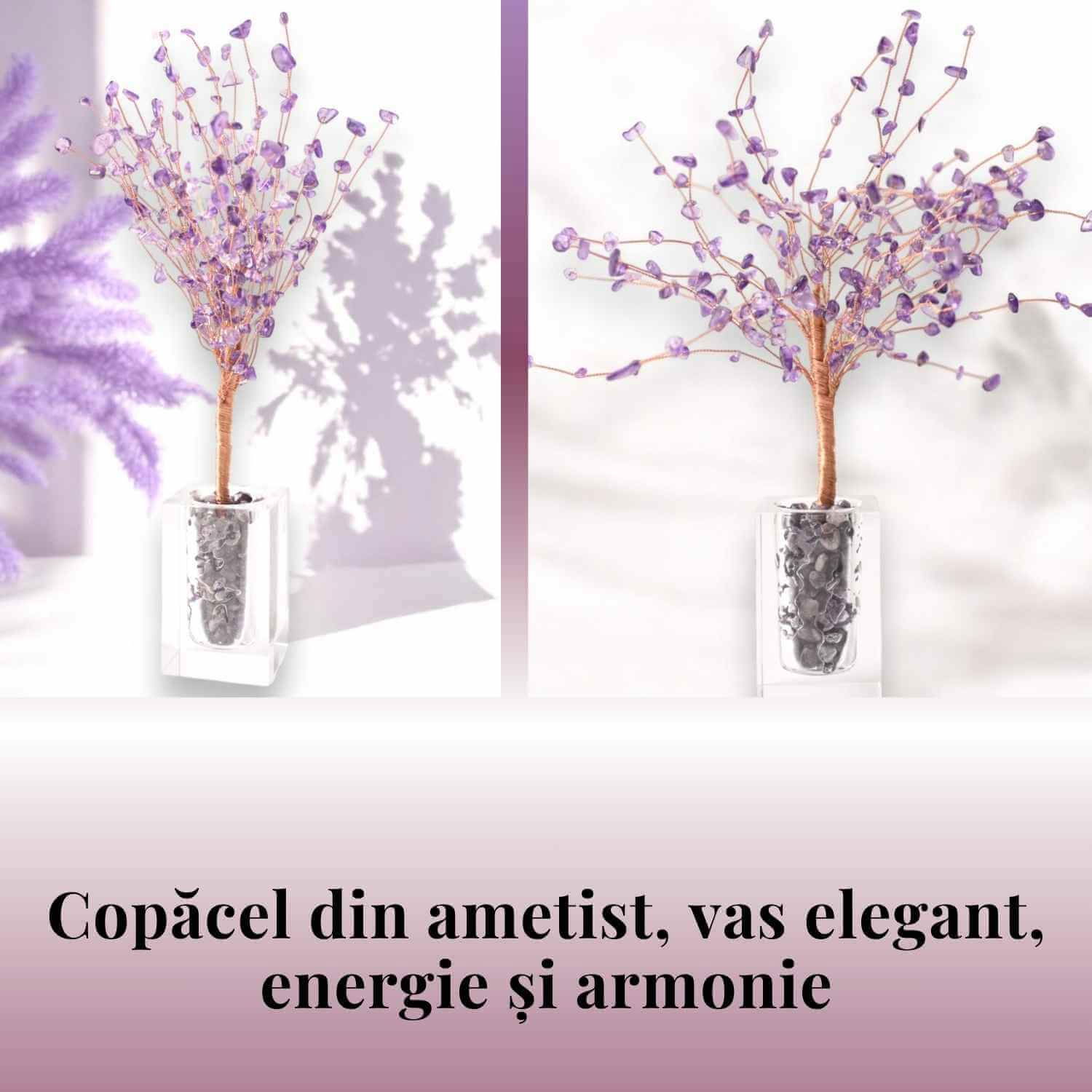 Copăcelul tip vază cu pietre naturale de ametist este un simbol al creșterii spirituale și al conexiunii cu natura. Fiecare ramură reprezentând un aspect al vieții, iar pietrele de ametist aduc echilibru și claritate mentală. Acesta poate fi utilizat atât ca obiect decorativ, cât și ca un talisman pentru armonie și prosperitate.